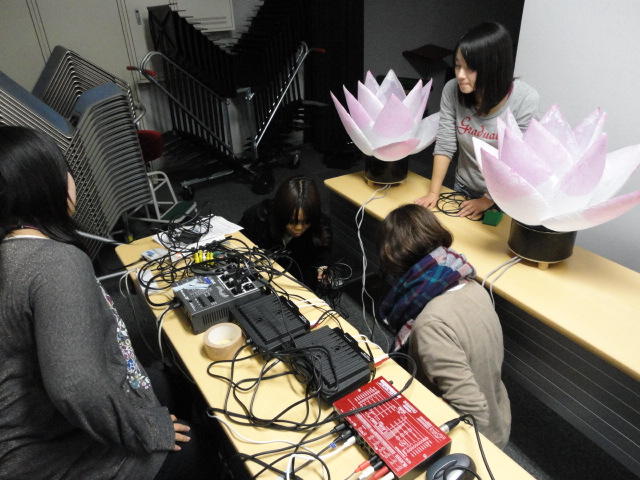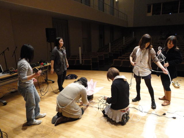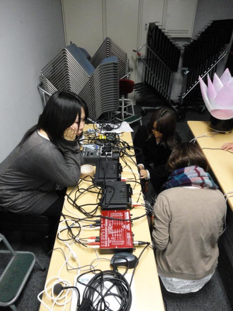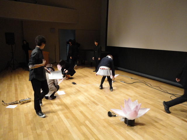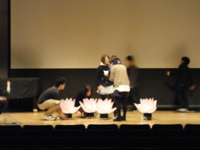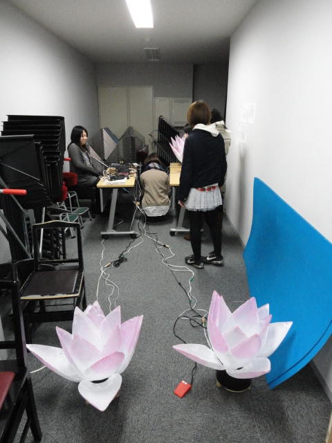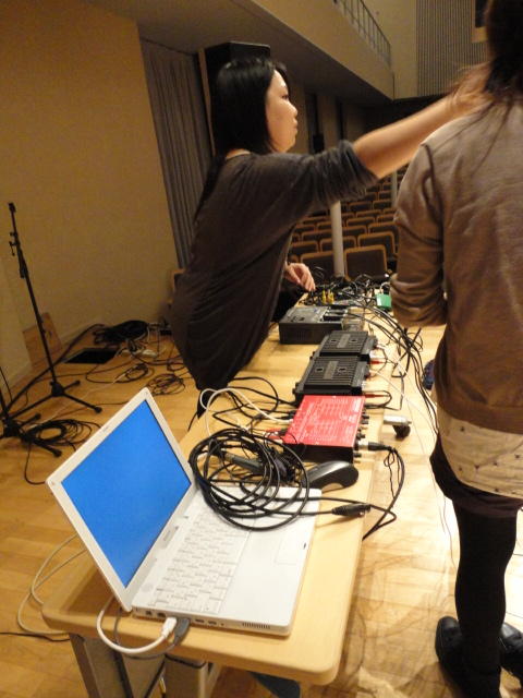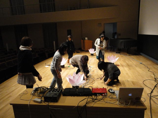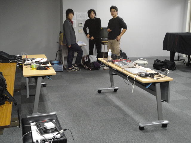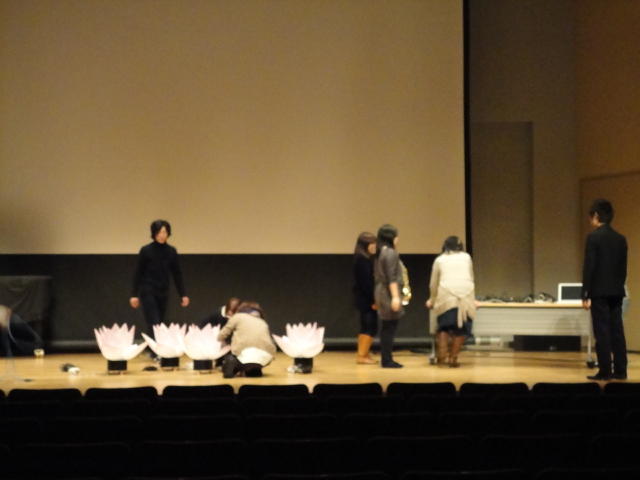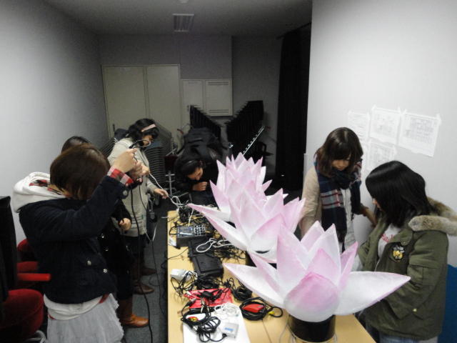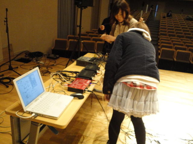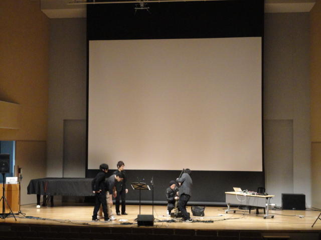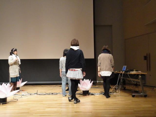 2010年のインカレは、例年と違ってかなり変則的になりました。参加作品としては、僕のCommゼミの今村さんのライブコンピュータ音楽作品の公演、さらに竹田さんと藤嶋さんのアニメーション映像作品上映、と充実したのですが、僕が1日目だけの参加で、翌朝からロシアに出かけてしまったので、写真は3日間のうちの初日だけしかありません(^_^;)。参加したのは4回生の3人(今村・片桐・田畑)と勉強のために参加した2回生の3人(奥山・田中・坂本)に、さらに初日の晩から合流してくれた実習指導の嶋田さんでした。皆んな、準備からステージ周り、さらに打ち上げまでよく頑張りました。(^_^)田畑綾佳