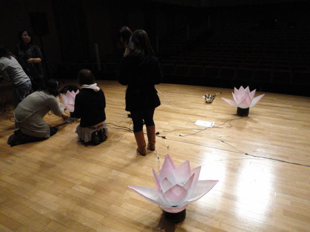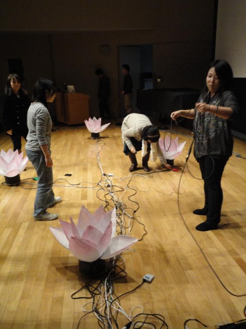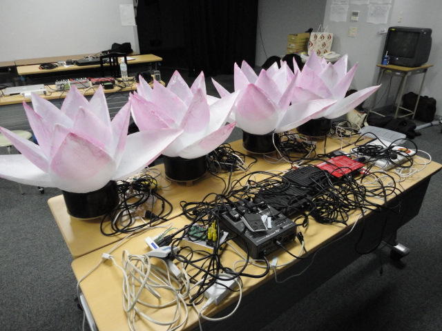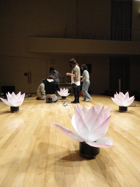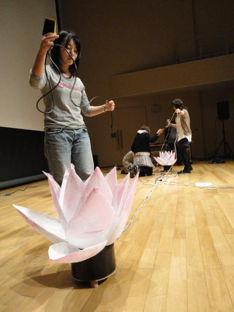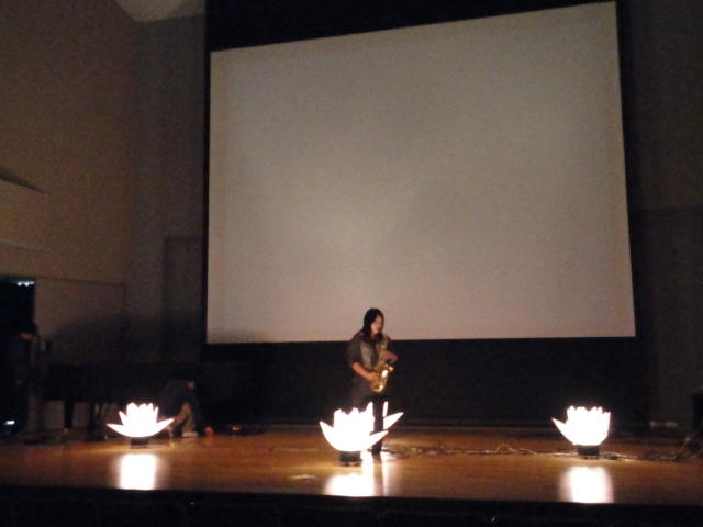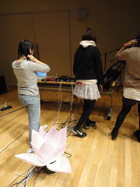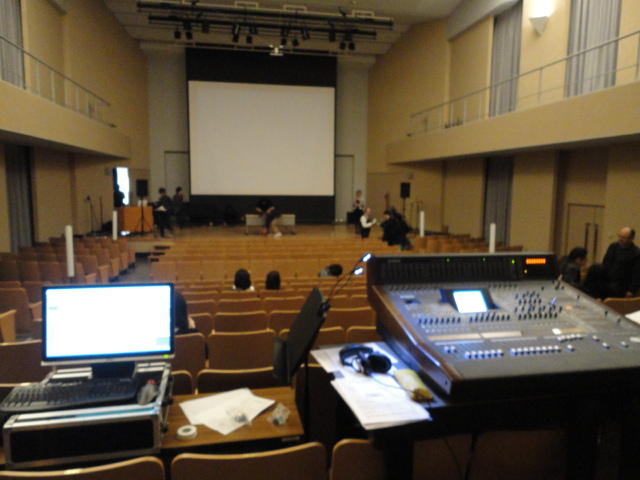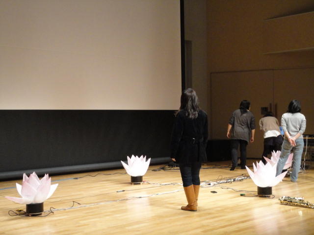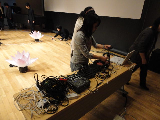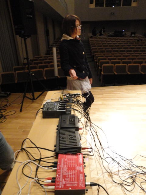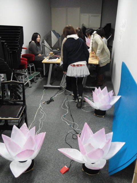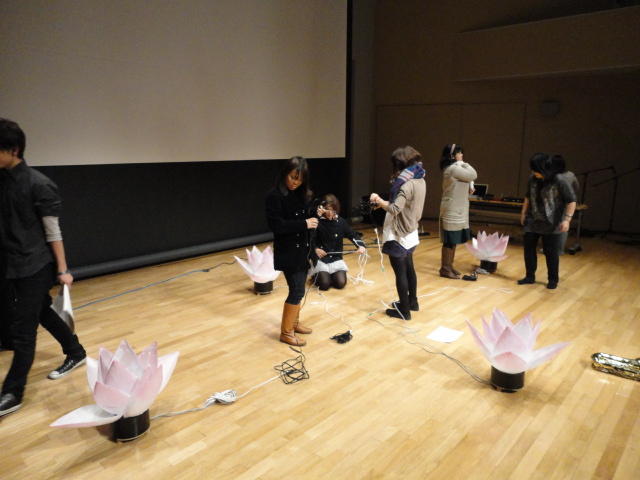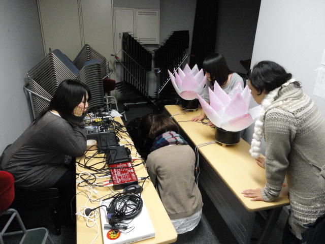 2010年のインカレは、例年と違ってかなり変則的になりました。参加作品としては、僕のCommゼミの今村さんのライブコンピュータ音楽作品の公演、さらに竹田さんと藤嶋さんのアニメーション映像作品上映、と充実したのですが、僕が1日目だけの参加で、翌朝からロシアに出かけてしまったので、写真は3日間のうちの初日だけしかありません(^_^;)。参加したのは4回生の3人(今村・片桐・田畑)と勉強のために参加した2回生の3人(奥山・田中・坂本)に、さらに初日の晩から合流してくれた実習指導の嶋田さんでした。皆んな、準備からステージ周り、さらに打ち上げまでよく頑張りました。(^_^)田畑綾佳