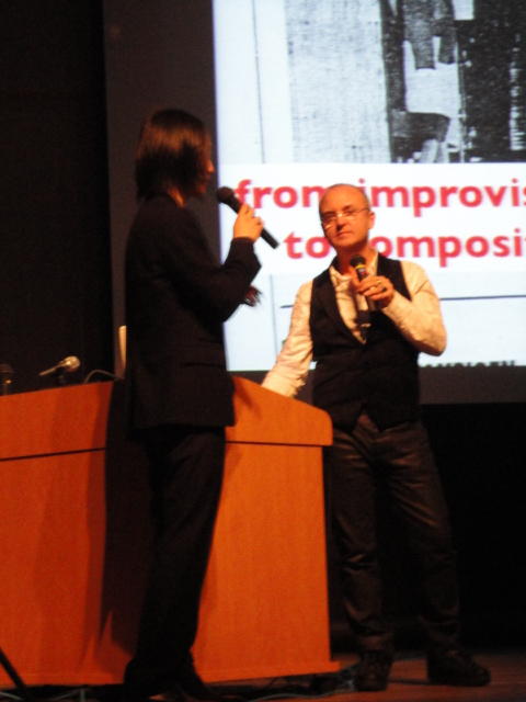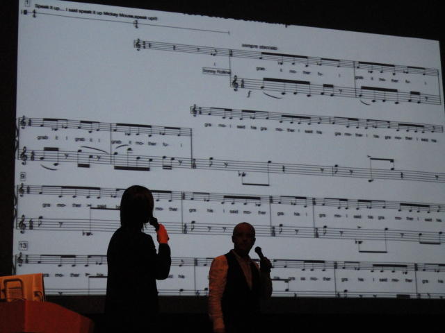 私は今回参加したIC2010で、多くの刺激を受けることができた。 今回のICに参加させてもらったのは、インターネットなどでは 得られない生のアート作品に触れ、メディアアートというまだ拡張・発展 途中の分野で活躍する同年代の人たちと会ってみたかったからだ。 そして、ICコンサートでのパフォーマンスや、さまざまな大学から のインスタレーション作品は私たちが大学で学んできた作品の 概念をこえるものだった。 ライブパフォーマンスの中で心に残った作品を3つあげる ・IAMASの水元賢興さんのPotential of a cimputer as an instrument ・多摩美術大学の丸山透さん、玉利広太郎さん、間宮尊さんの Like"human"Robot.-21-周衝波音 ・東京芸術大学大学院の松本昭彦のAntiphon 水元さんの作品はラップトップコンピュータを分解していく過程で 基板から抽出した電流を音楽にしてしまうというものだった。これは アイディア自体に驚かされたし、画面も連動して映し出されていた のだが、壊れる最後の瞬間とそのあとの静寂がとても印象に残って いる。また、水元さん本人と懇親会で話をさせていただく機会 があり、 他にも破壊系の音楽をたくさん作っているというお話を聞いて、その 姿勢に圧倒された。 多摩美生3人の作品は、身体表現とコンピュータ音楽を合わせた パフォーマンスだった。これは演技的要素を多く含んでおり、コードが 一人のパフォーマーの胸に繋がっていて身体の振幅の変調を演じる のだが、その演技は客席すべてが緊張感に包まれながら見入って しまうものだった。彼らとも懇親会で話をする機会があったのだが、 三人とも情報デザイン学科2回生ということで、私と同じ学年の学生 だったことにも驚かされた。 そして芸大の松本さんの作品は音楽もさることながらグラフィックの 美しさに圧倒される作品だった。本人が制作した音楽理論的 アルゴリズムにのっとる演奏の軌道データというのも奥が深く、 完成度の高さを感じさせられた。 はっきり言って、音楽の専門的知識はほとんどない私からすると 作品の中でも多くの数を占めていたノイズミュージックはその良さ がよくわからず、とにかく大音量に圧倒されていたのだが、こんな 作品も世の中にあるのかという衝撃は大きかった。 インスタレーション作品ではGoogle Earthを用いたものや、ドラム セットでゲームをコントロールする作品、回転する赤外線センサーで 周囲の人の位置情報を得て演奏をする作品などがあった。どの作品も 直に作者の解説を聴くことができ、とても勉強になった。 IC2010での体験で私が得たものは、コンピュ―タ音楽に対する興味と これからの作品制作に対する意欲だと思う。前にも書いたように同年代の 制作者たちの話を聞いて私の中での『作品』の概念が大きく広がった。 懇親会で仲良くなった彼らとまたどこかで会うことができるように私も 自分自身の作品を作っていこうと思う。今村モモ