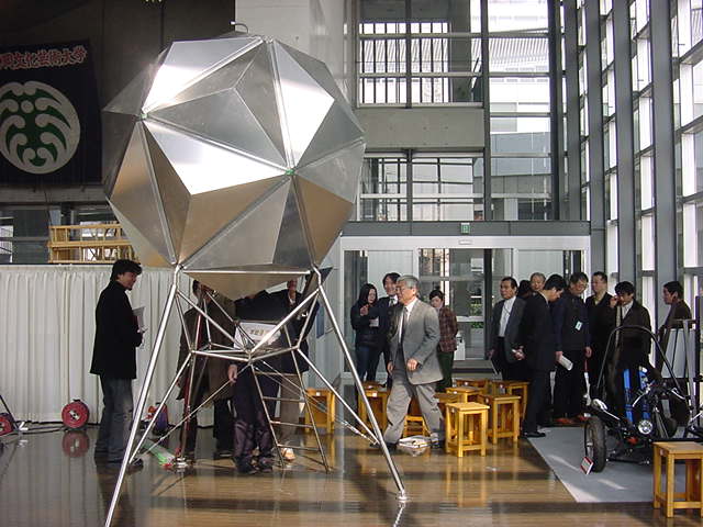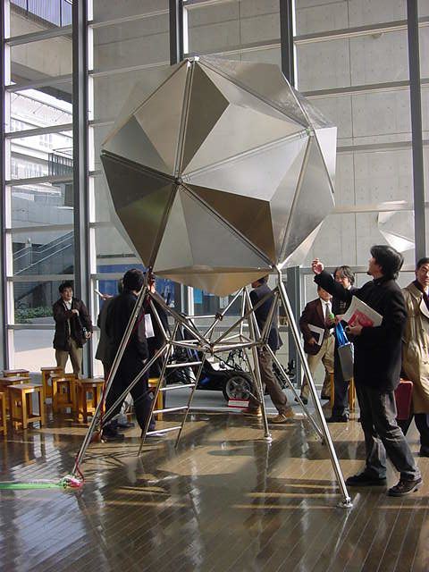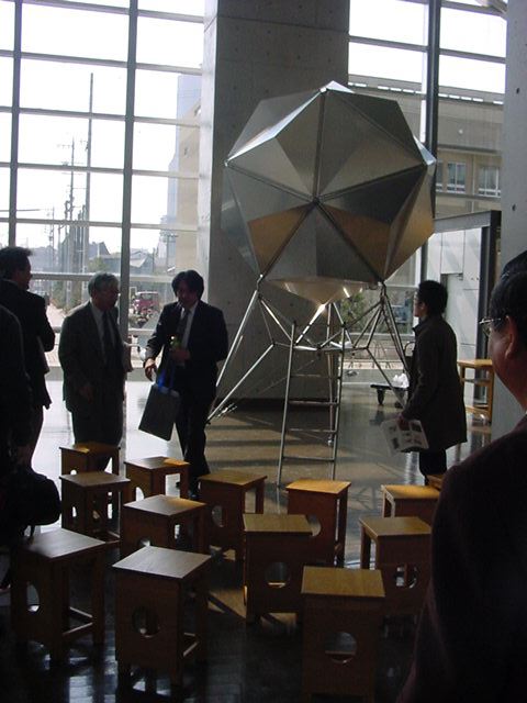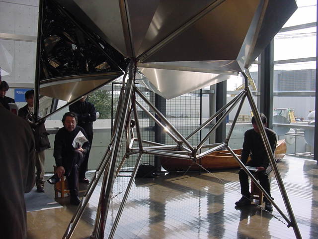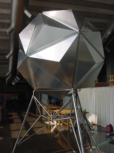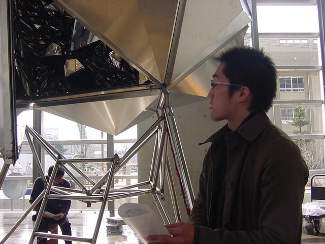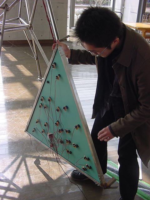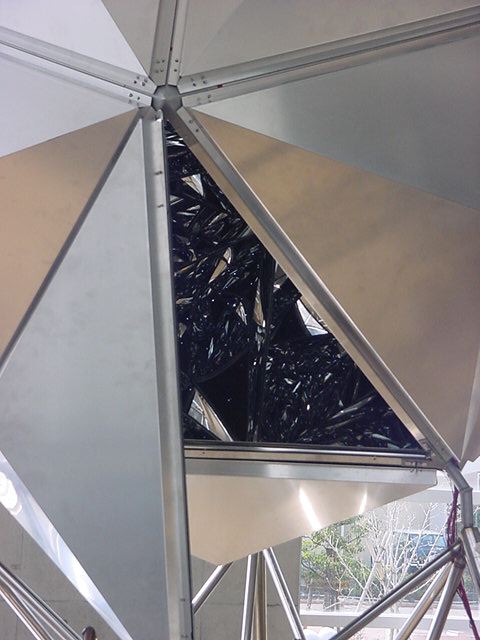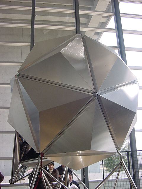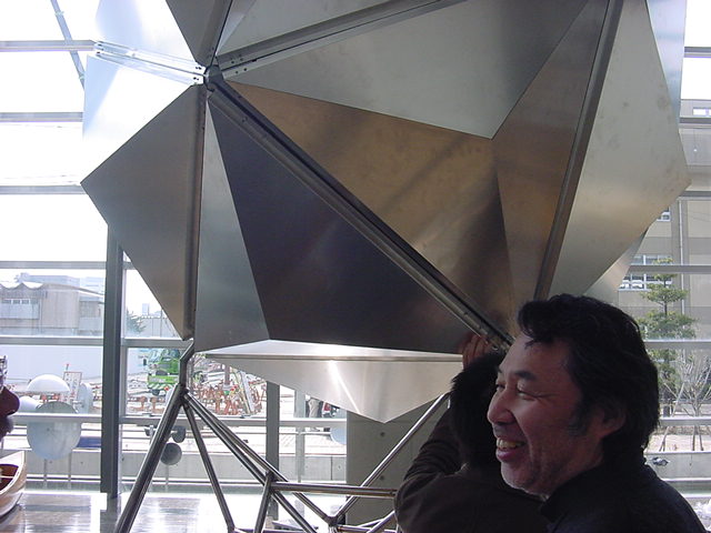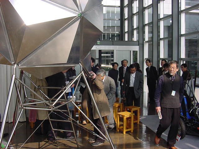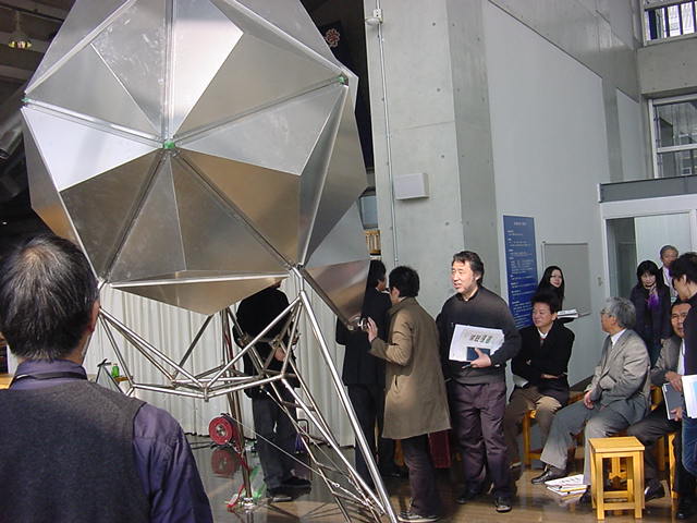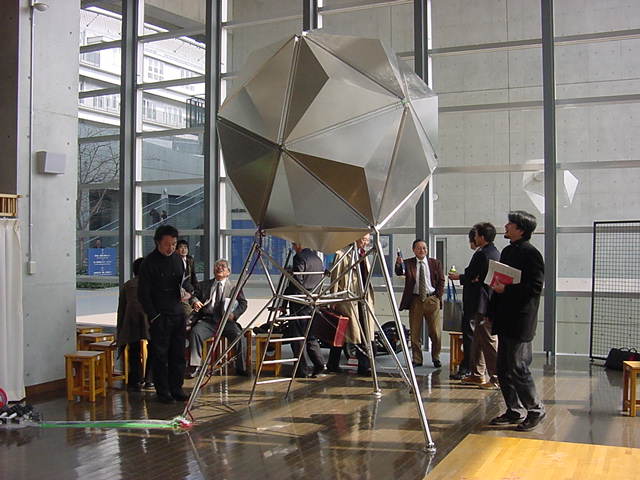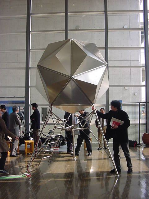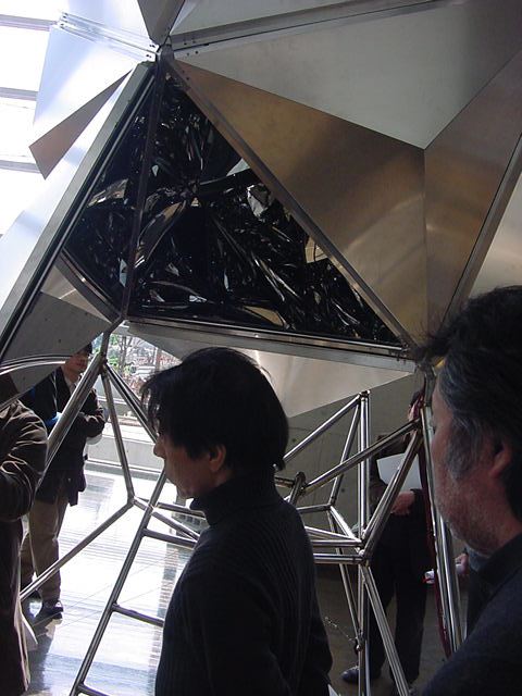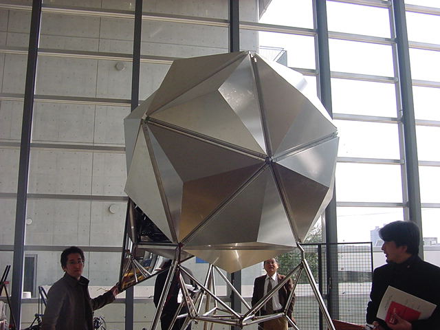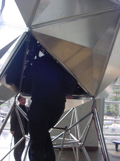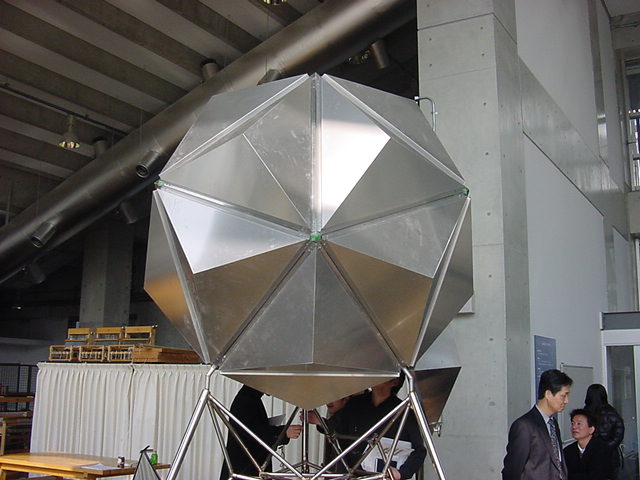 - 概要 巨大な金属造形は1辺60cmの正三角形による正20面体であり、来場者は梯子を登って交互に1人、その中に入れる。20面の正三角形の内側はハーフミラーの合わせ鏡になっていて、それぞれ25個の白色LED(全体で500個)がゆるやかに明滅している。扉を閉じると暗黒となるが、そこに500個のLEDが、合わせ鏡によってそれぞれ異なる奥行きと明るさで明滅するので、まさに宇宙空間を体験できる力作。この作品は就職先の「GKテック」が動態保存のために引き取った