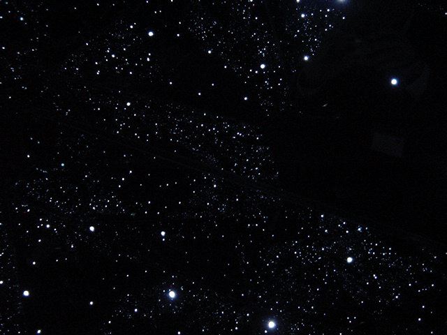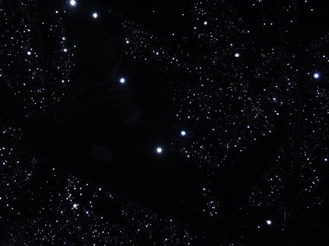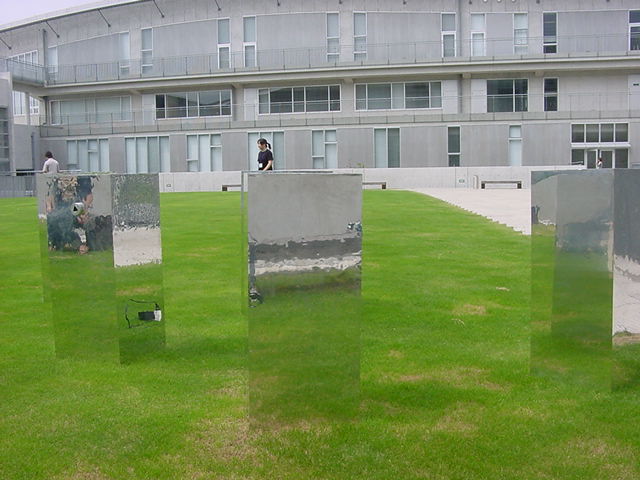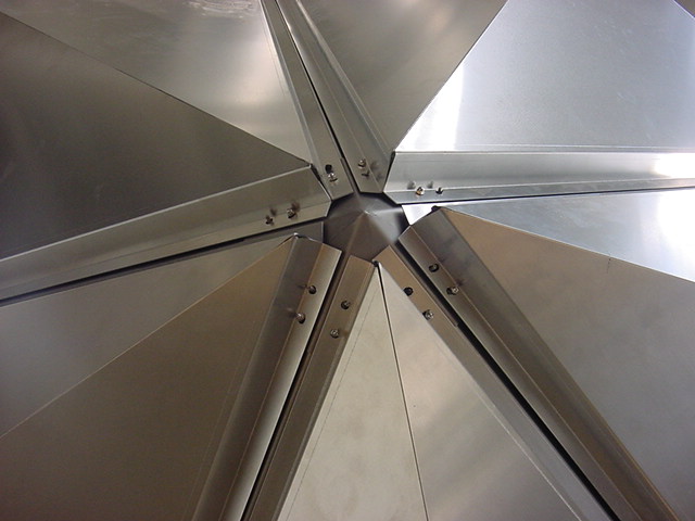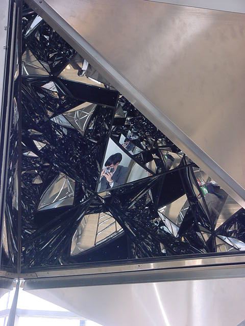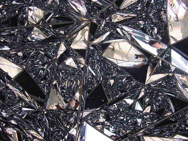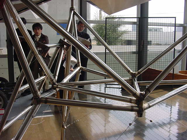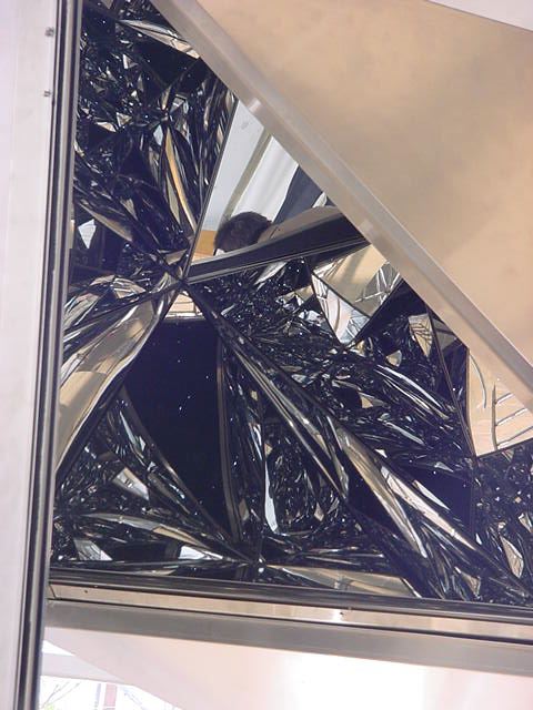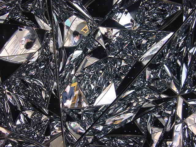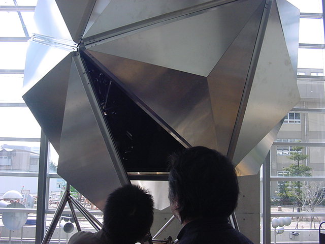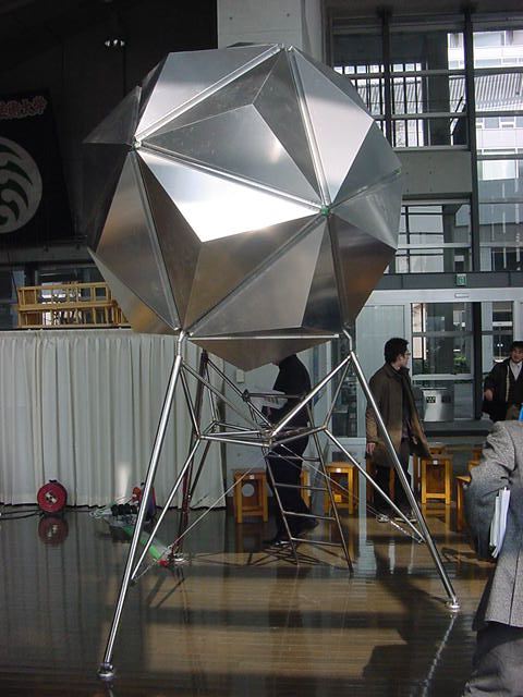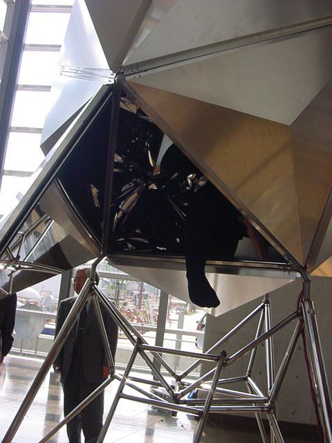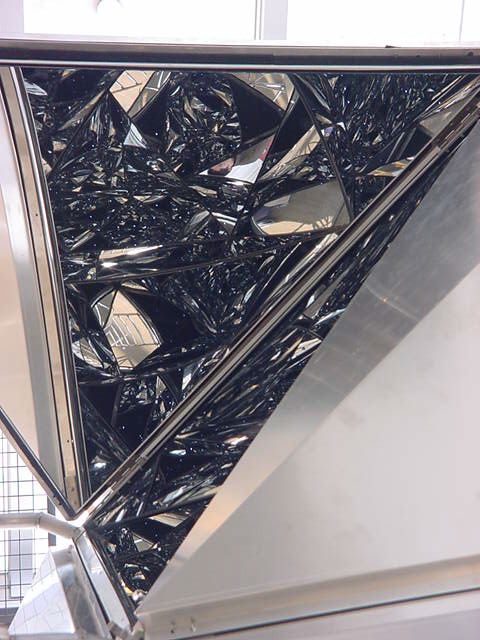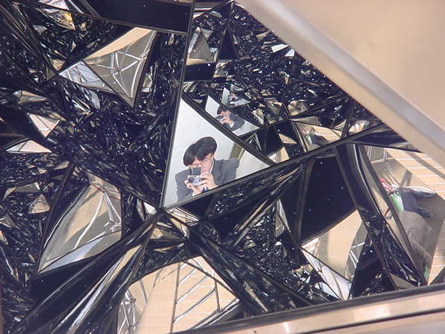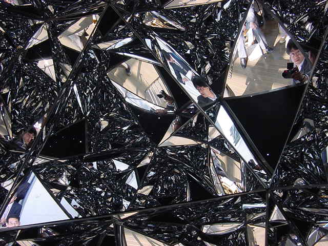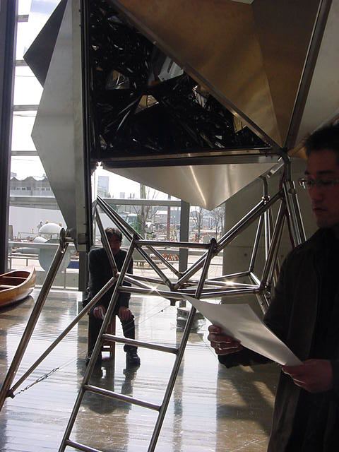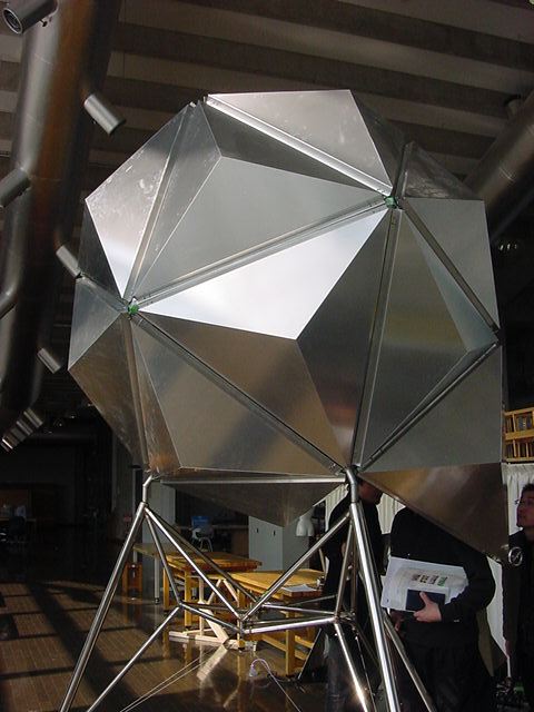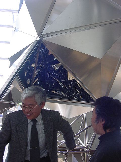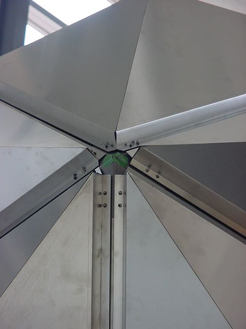 - 概要 巨大な金属造形は1辺60cmの正三角形による正20面体であり、来場者は梯子を登って交互に1人、その中に入れる。20面の正三角形の内側はハーフミラーの合わせ鏡になっていて、それぞれ25個の白色LED(全体で500個)がゆるやかに明滅している。扉を閉じると暗黒となるが、そこに500個のLEDが、合わせ鏡によってそれぞれ異なる奥行きと明るさで明滅するので、まさに宇宙空間を体験できる力作。この作品は就職先の「GKテック」が動態保存のために引き取った
