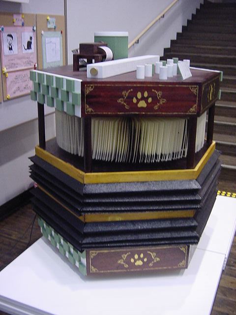 - 概要 350枚の切り絵パウチシートがドラムに埋め込まれて回転している。来場者が指をシートに入れるとパラパラアニメを同時に何人もで見ることができる。BGMはモーターが駆動する「黒ネコのタンゴ」のオルゴール演奏