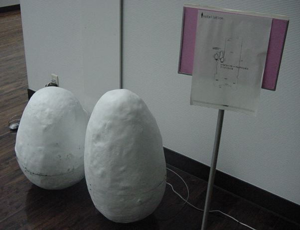 - 概要 巨大な卵の造形を来場者が持ち上げるとサウンドが鳴ってぶるぶると振動する ※一部未完成