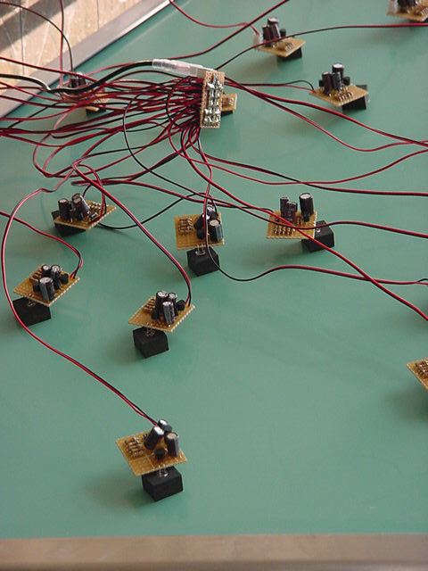 - 概要 8角形の台座にある赤外線センサが来場者を検知すると、蜂の羽音がしてターンテーブルが来場者正面の方向に回転し、多数の「蜂」が一斉に睨む