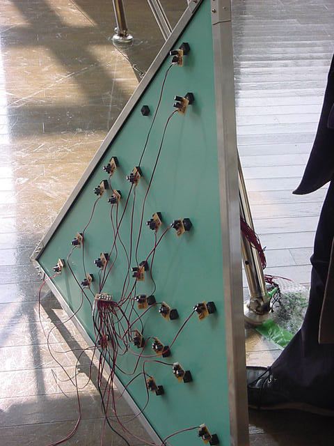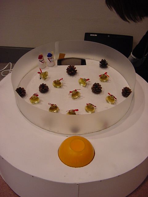 - 概要 来場者が触って傾きを変えられるピンボール台のような造形にボールを走らせる。手前のボタンを押して上部から出て来たボールが下りて来る途中で盤面の鈴スイッチに触れると色々なサウンドが出る