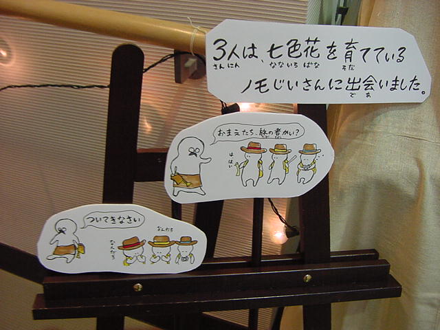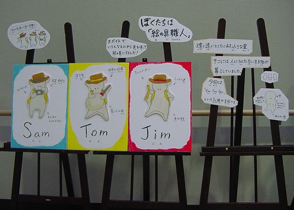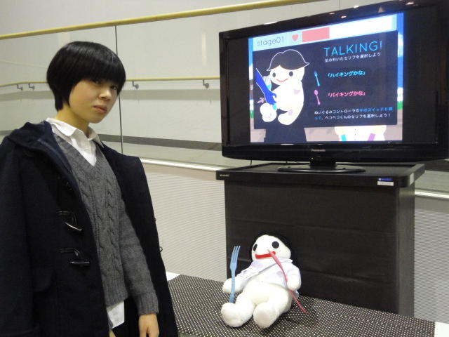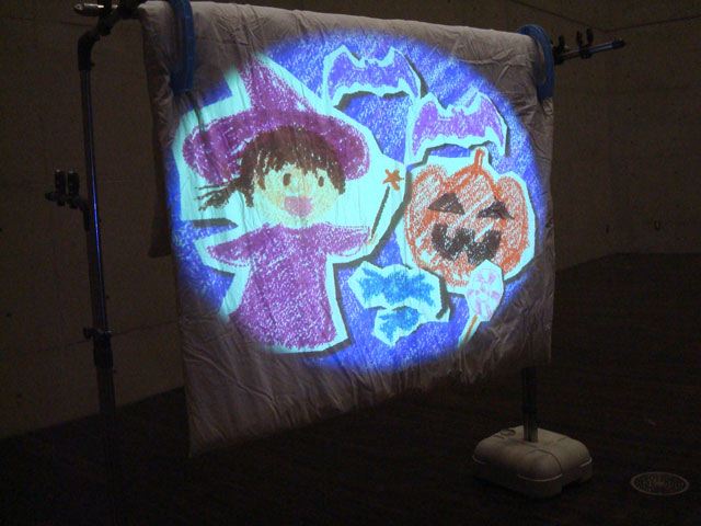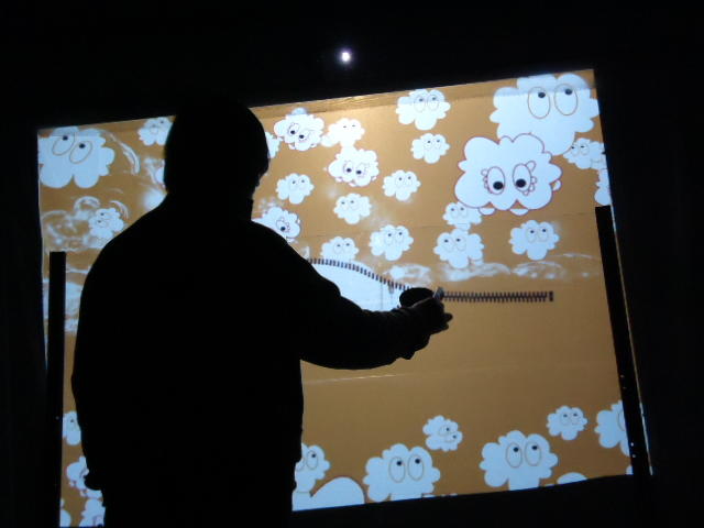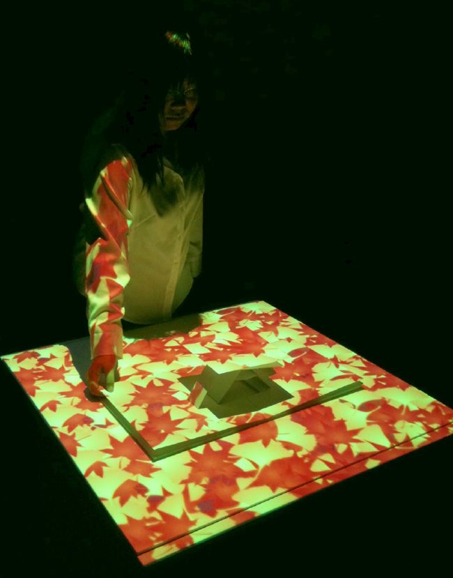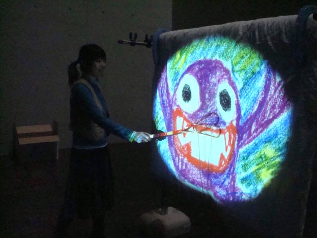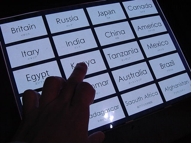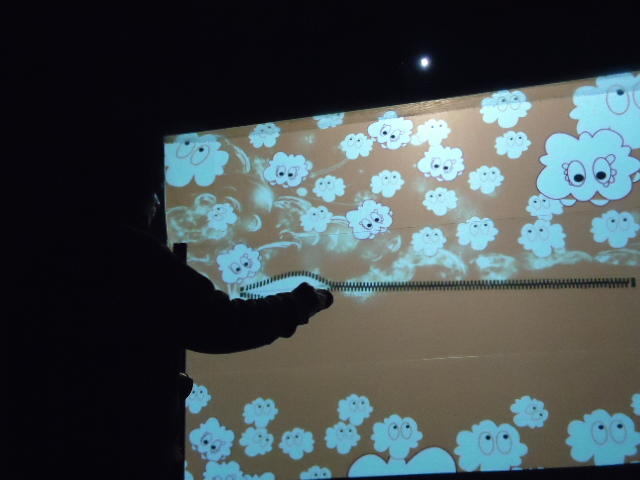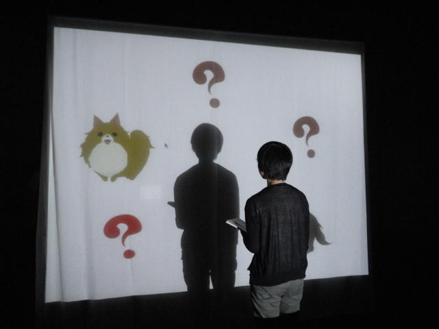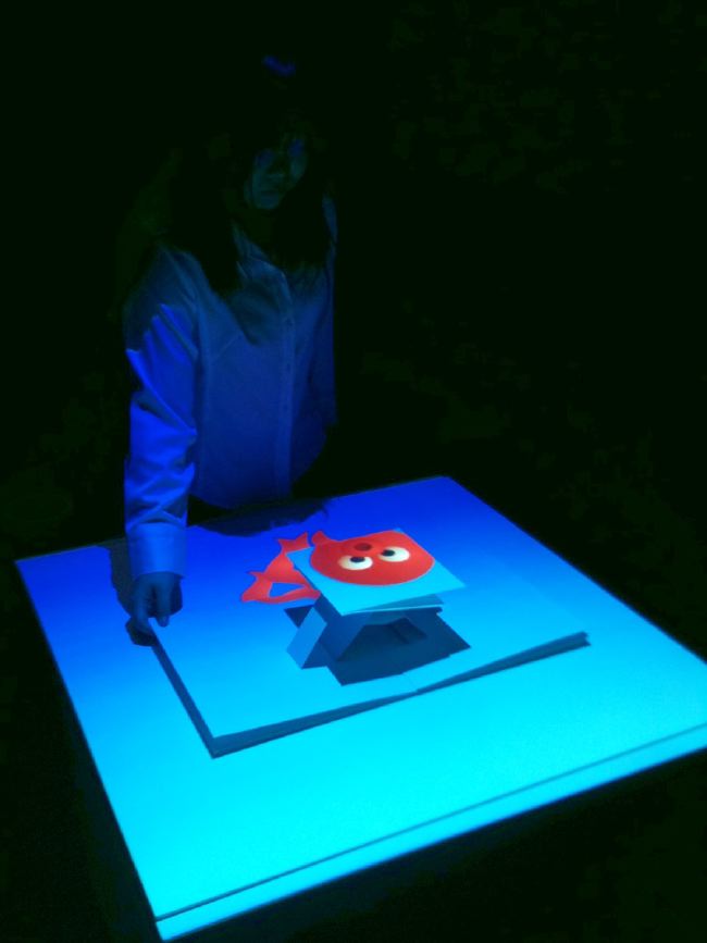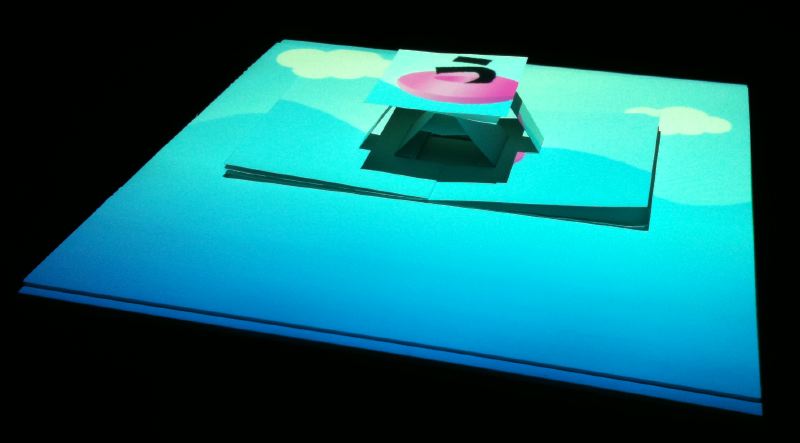 - 概要 プロジェクタで投射されているテーブル中央の「飛び出す絵本」のページをめくると、1つの文字が書かれたページが飛び出し、その文字から始まる言葉のアニメーションがテーブル全体に投射される