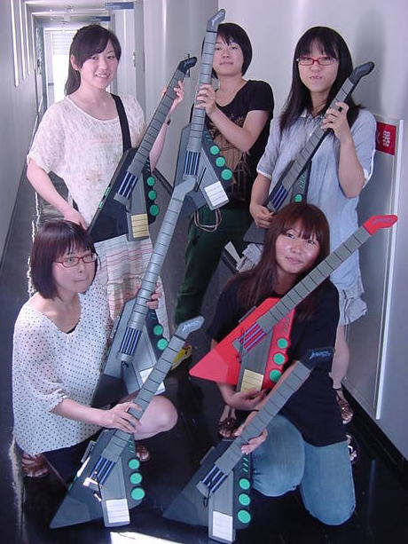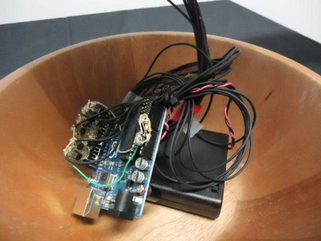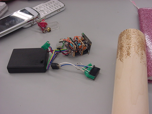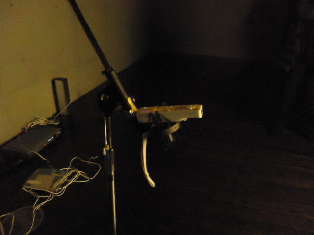 - 概要 前期「音楽情報科学」課題作品。改造三味線にカラーアルミ針金を3本張り、導電塗料を塗布したバチによる演奏情報を「タッチセンサ→Arduino→XBee」でワイヤレス送信し、「XBee受信→Arduino→Gainer」インターフェースにより受け取り、「太鼓の達人」のように音楽と同期して正しい弦を正しいタイミングで弾くFlashゲーム