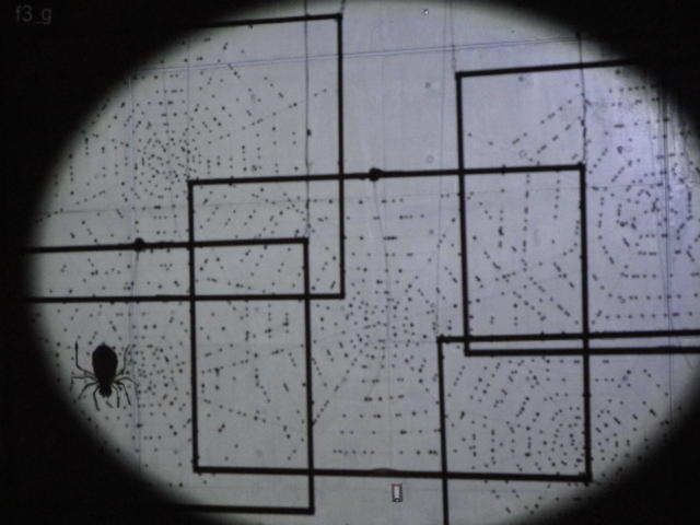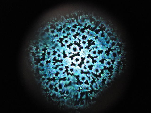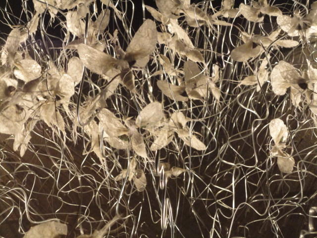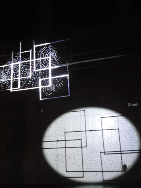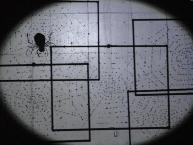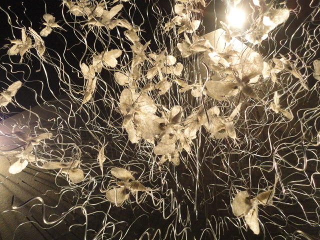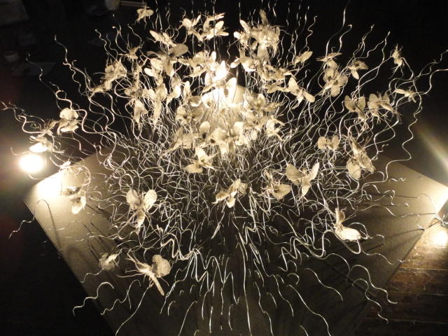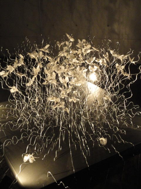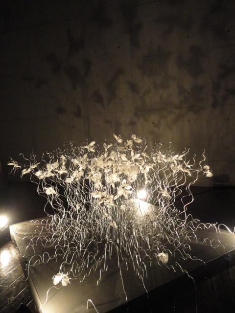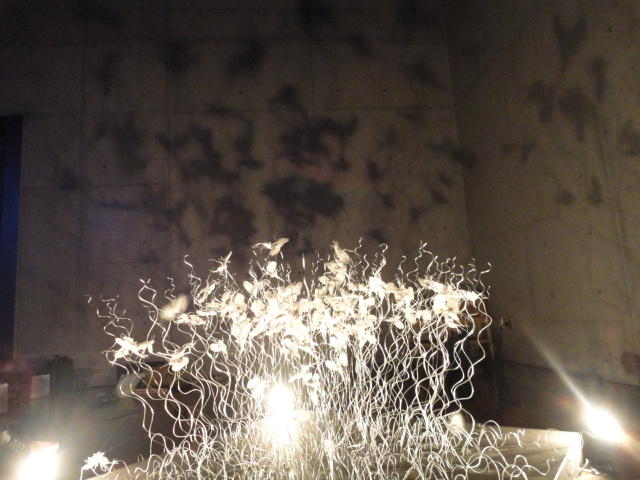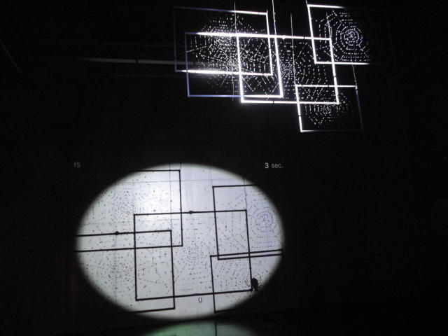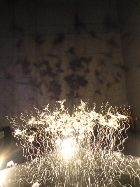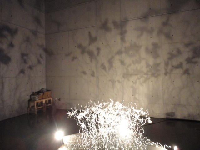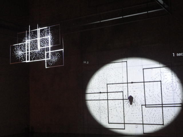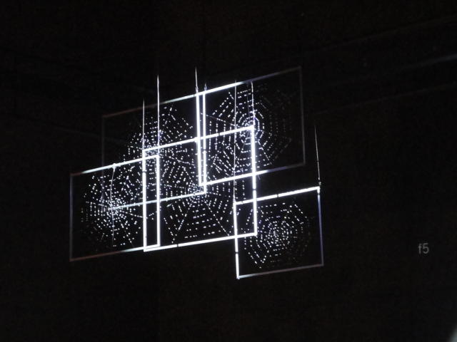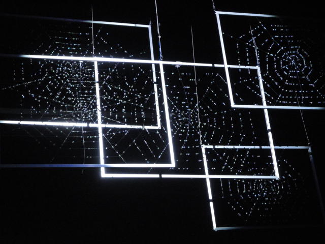 - 概要 暗い「瞑想空間」の中央に、雫のようなクリスタルの付いた5個の「クモの巣」の造形があり、後方のプロジェクタからの光でクモの巣の影が壁面に投射される。ときおり巣が揺れると、映像の中の巣だけにクモの姿が現れる