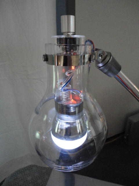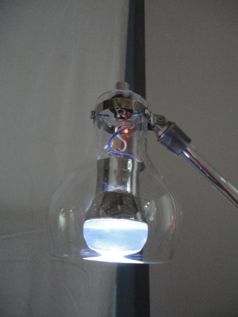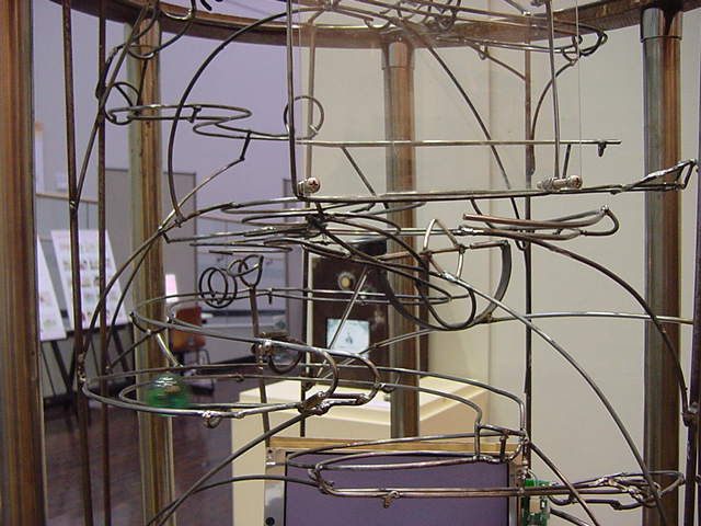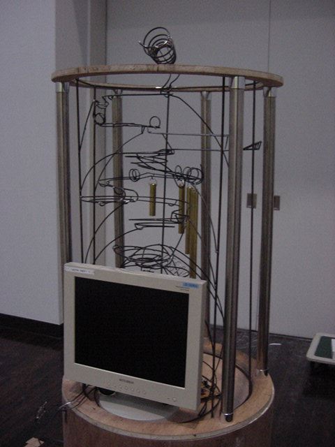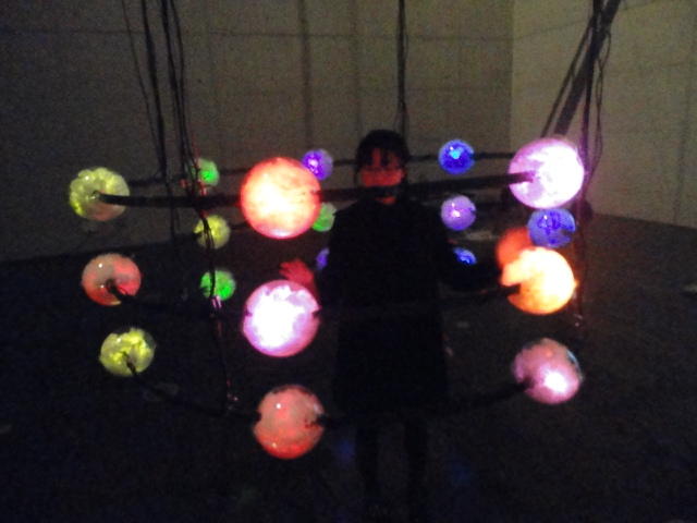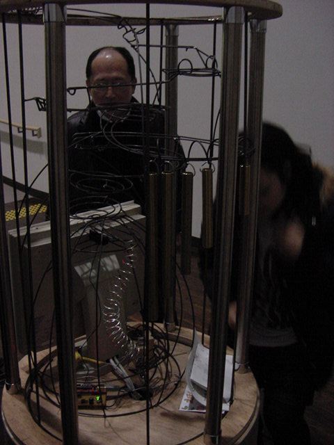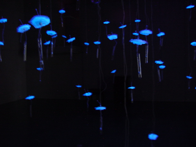 - 概要 「瞑想空間」に吊るされた100個の物体がブラックライトに浮かび、それぞれ内蔵された小型モーターがランダムに振動して試験管のようなガラス容器から音がする
