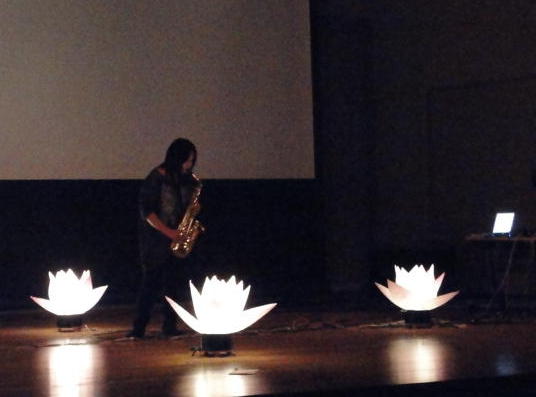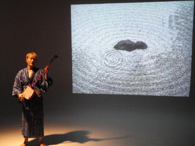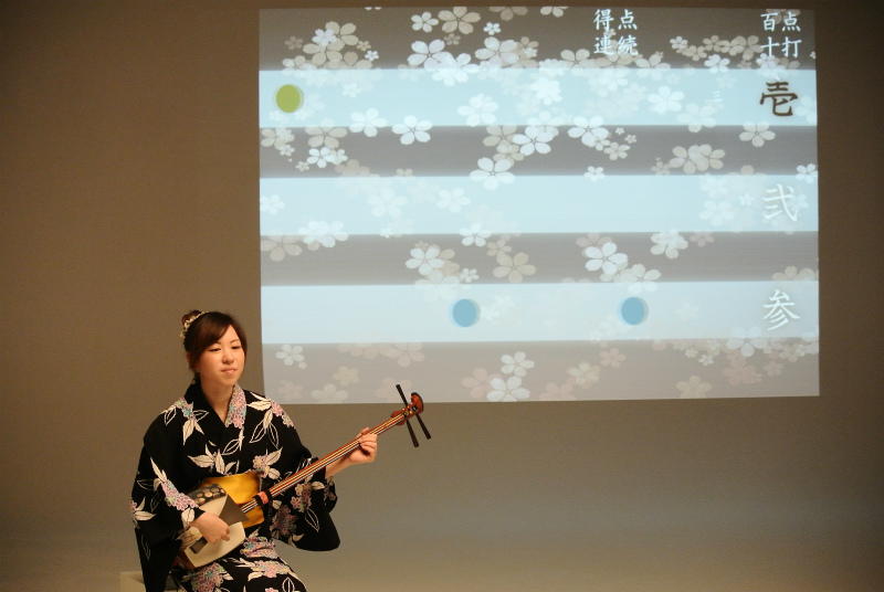 - 概要 三味線を改造した楽器を演奏するパフォーマンス。背景音楽とライブ投射映像は、海外から日本に来た外国人が目新しく感じる日本の音風景をテーマとしている