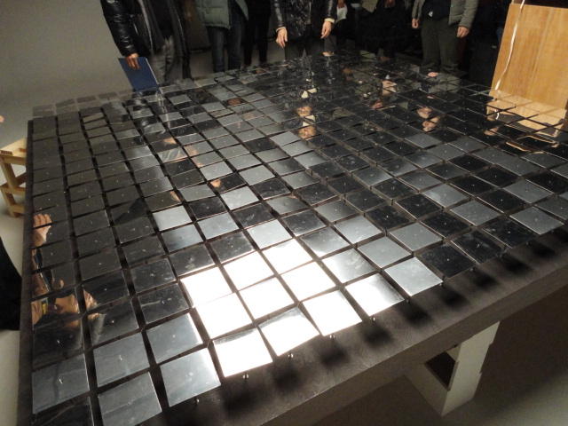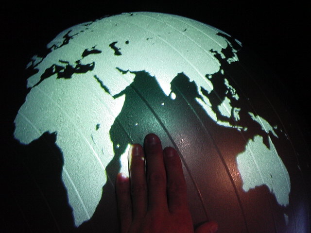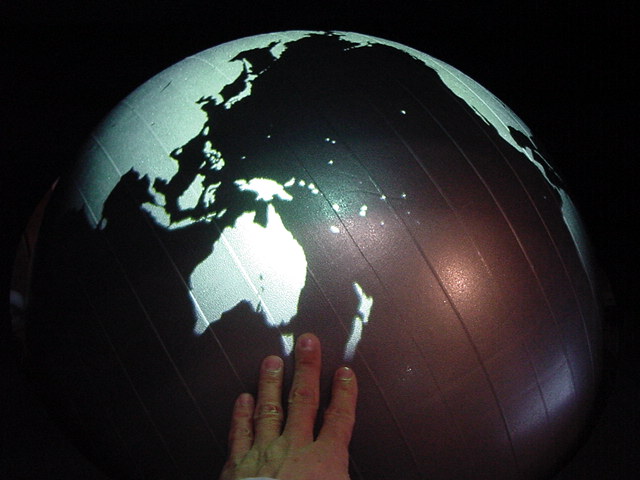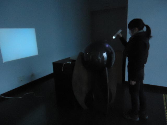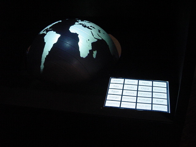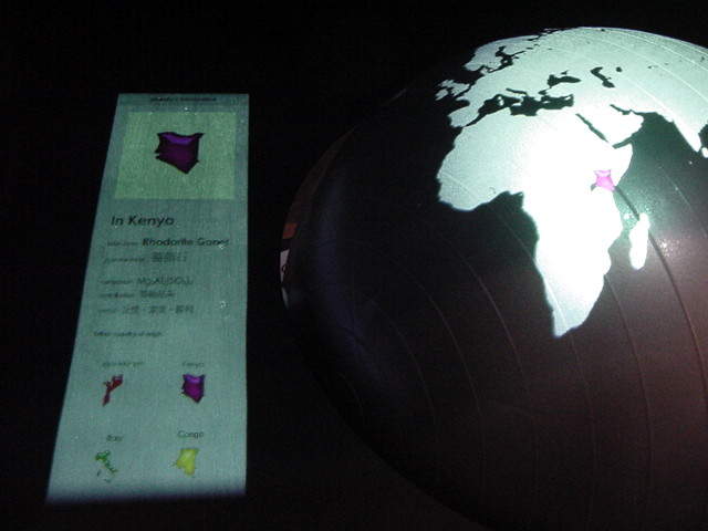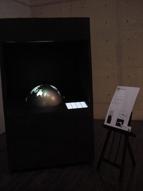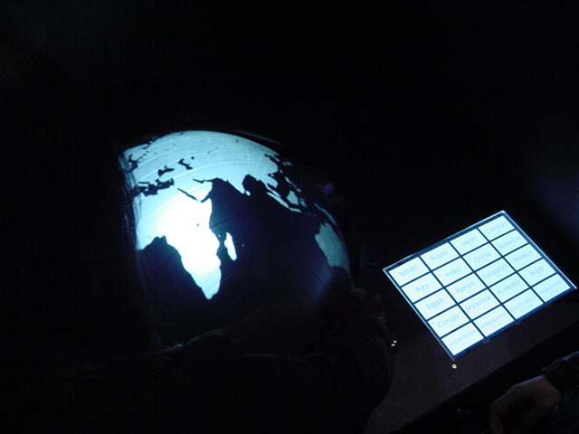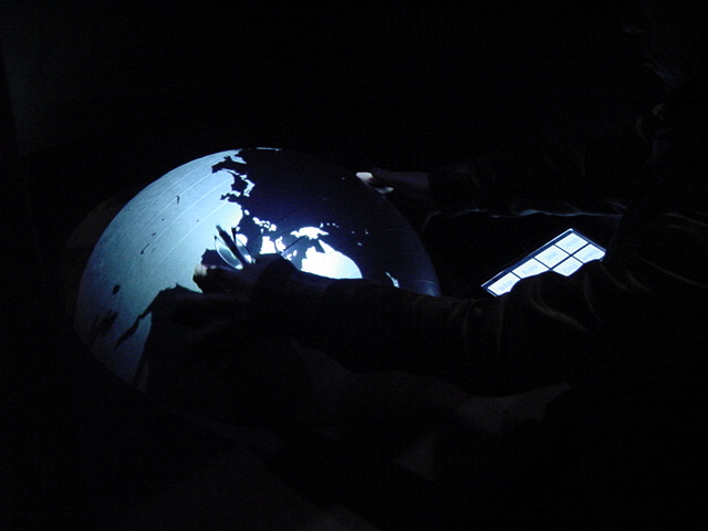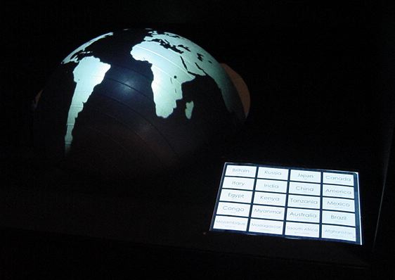 - 概要 直径60cmの黒い球体(地球儀)に紫外線ライトを当てると海洋が光り陸地と区別できる。球体を自由に回転させてセンサを仕込んだ22カ国が照らされると、それぞれの国のエネルギー状況についての情報が投射される