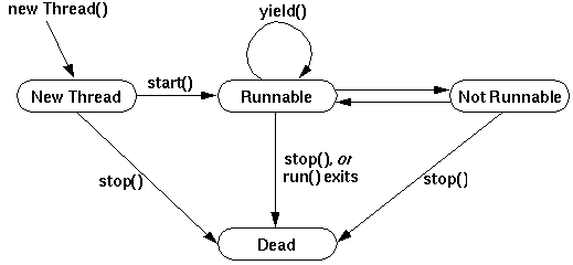And a final word about thread state: the programming interface for the Thread class includes a method calledisAlive(). TheisAlive()returns true if the thread has been started and not stopped. Thus, if theisAlive()method returns false you know that the thread is either a "New Thread" or "Dead". If theisAlive()method returns true, you know that the thread is either "Runnable" or "Not Runnable". You cannot differentiate between a "New Thread" and a "Dead" thread; nor can you differentiate between a "Runnable" thread and a "Not Runnable" thread.See Also