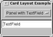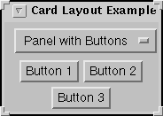 Here's example code for using CardLayout. Here's the example program, running as an applet: Your browser can't run 1.0 Java applets, so here are pictures of the window the program brings up: