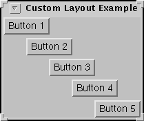toString()method. Layout managers don't actually draw Components. They simply invoke each Component'sresize(),move(), and/orreshape()to set the Component's size and position.Here's source code for a custom layout manager named DiagonalLayout. It lays out components diagonally, from left to right, with one component per row.