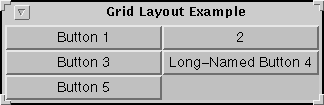 Here's example code for using GridLayout. Here's the same program, running as an applet: Your browser can't run 1.0 Java applets, so here's a picture of the window the program brings up: