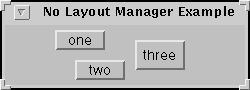 Here's example code that uses no layout manager. Here's the same program, running as an applet: Your browser can't run 1.0 Java applets, so here's a picture of the window the program brings up: