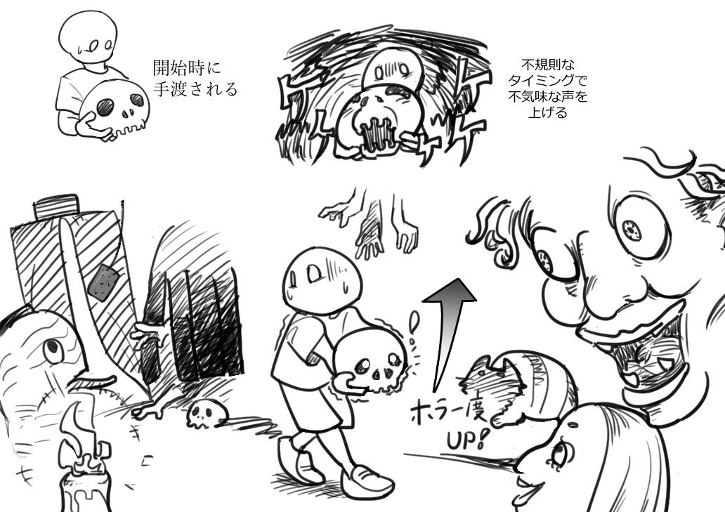 まず、イメージイラストが秀逸です(^_^)。この絵力は今後のデザインにフルに生かして下さい。手の震えを検出してサウンドにするよりも、この企画だとサウンド+発光+振動・・・といきたいのですが、振動を発生させると震えセンサが反応してハウリングとなる?という悩ましさがあります。実はその解決方法としては、どうせマイコン(Arduinoなど)を内蔵するので、「普段は振動子を止めておいて震えをセンシング」→「震えを検出したらセンサを止めてバイブさせる」というように、時間的にモードを切り替えることで、十分に体験者にホラーを提供できます。しゃれこうべというのは、そこそこの大きさと重さが必要なので、電子回路と電源(電池)を内蔵させるにも好都合です
