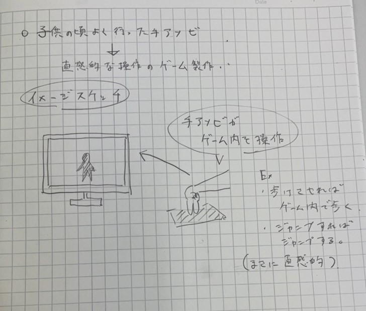 - 私が考えた作品のアイデアは子供の頃の手遊びを直感的な操作のゲームにすると言うものです。具体的にはよく子供の頃にやっていた、手が人形を作り想像で遊んだり、車の窓から見える障害物を避けたりと言った遊びをモデルにすることを考えています。これをゲームに落とし込む方法としては、手で人形を作ることをコントローラーとして見立て、実際にモニター内のアバターを操作するという方法を考えています。ゲームはコントローラーや、キーボードとマウスを使用しますが、これらは「慣れ」というのが関わってきます。そこで子供やお年寄りでも操作ができる直感的な操作ができるものを作りたいと思います。