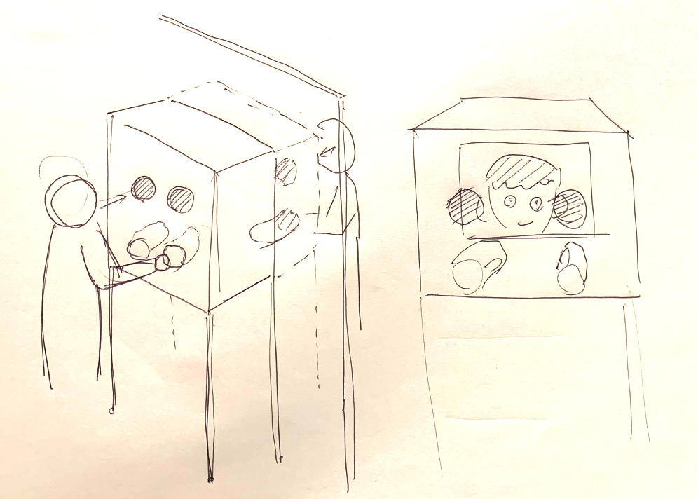 - 文化祭で展示されたお化け屋敷の様子から順番を待っている行列自体も作品のひとつだと言うのを見て、簡単に誰でもすぐ体験できるものではなく、大人気カフェや有名テーマパークの様に少し長めで並ぶ時間は多いが一人一人の満足度が高い作品の方が魅力的なのではないかと感じました。そこから、一人一人の満足度を高めることが出来、少し時間はかかるが、誰でも年齢性別を問わず体験することが出来るものを考えました。ひとつの箱を覗くと向こう側にはキャラクターが写っており、液晶パネルの下には手が伸びている。自分側にも手を入れる穴と手袋があり、それを使って握手をする。相手側はロボットかと思いきや、向こう側にも人が入っており、新たな出会いやコミュニティの輪を広げる。