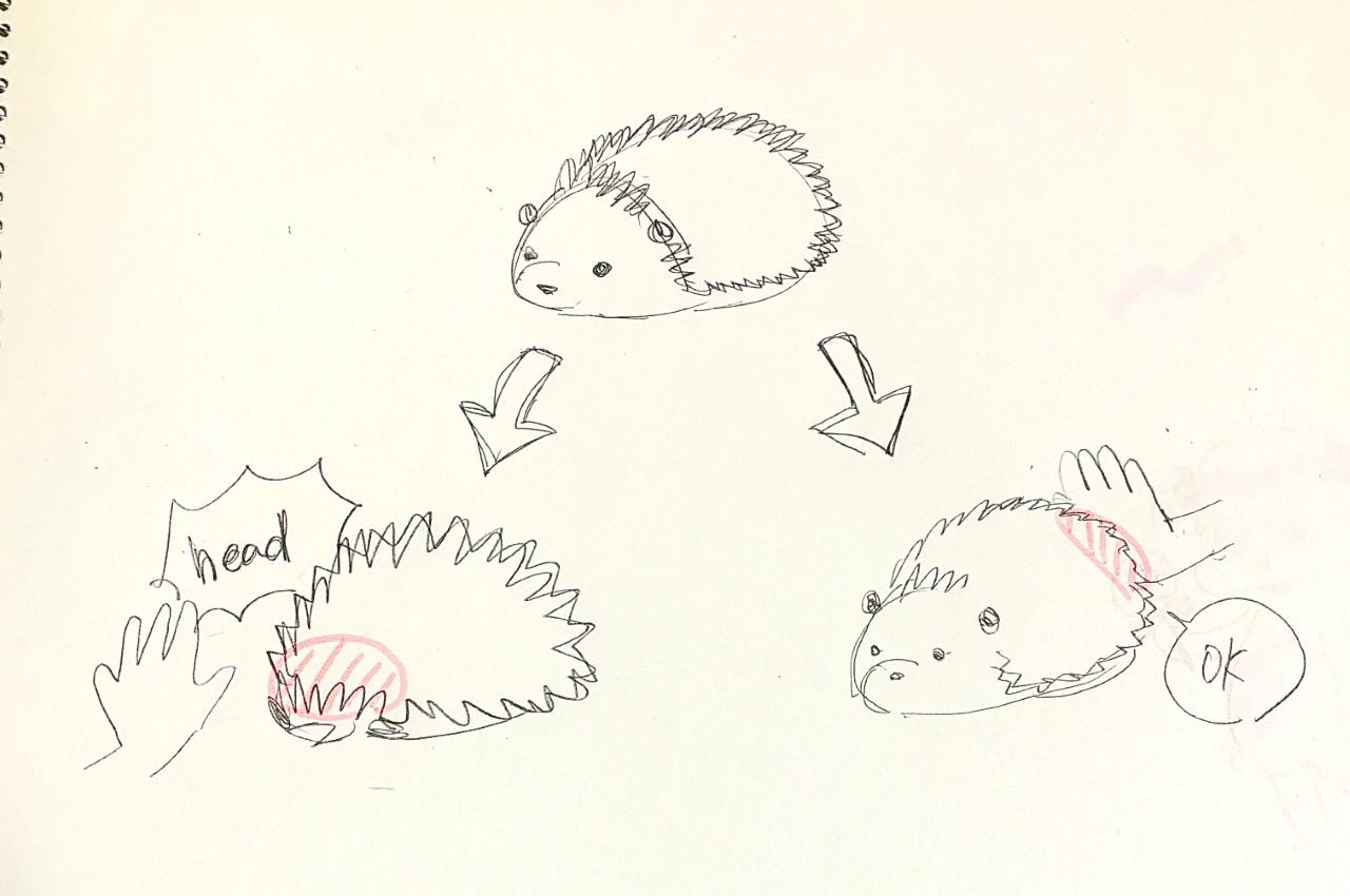 - 私は「植物会議」を見て人間が影を意図的に作ることによって植物が光ったり動いたりする仕組みが面白いと思いました。そこから、人間が生きものに関わるという発想を元にはりねずみを撫でる時に場所によっては、はりねずみが丸くなって針をたてるという作品を考えました。ほとんどのはりねずみはおしりとおしり付近の背中は触らせてくれますが、脇腹や頭は嫌がり針を立ててしまいます。私はこのはりねずみの仕組みを再現したいと思いました。この作品によって、普段触る機会の少ないはりねずみですが、どこを触るとはりねずみは怒るのか知る経験が得られるので知識となり面白いのではないかと考えました。1つ知識を得る事は、動物園やアニマルカフェではりねずみとコミュニケーションを円滑に取るための1歩にもなると考えています。