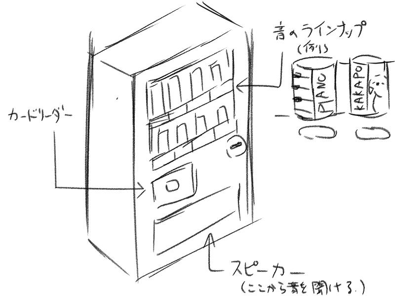 - 作品事例の一つである「ガチャガチャ映像マシン」のような、身近な装置による体験を取り入れた仕組みは自分にとって斬新に感じられた。この発想から、インタラクティブな作品企画として「サウンド自動販売機」を提案する。概要としては、装置のボタンを押して品目を選択し、電子マネーを模したカードをかざすと、取出口を模したスピーカーから実際に音が流れるというものである。サウンド(品目)の例としては、様々な楽器の音色や演奏、珍しい動物の鳴き声などを想定している。他にも「ランダムな自動演奏が再生される」などの品目がいくつかあると、音源が有限的でなくなり、より多彩な体験ができると考える。