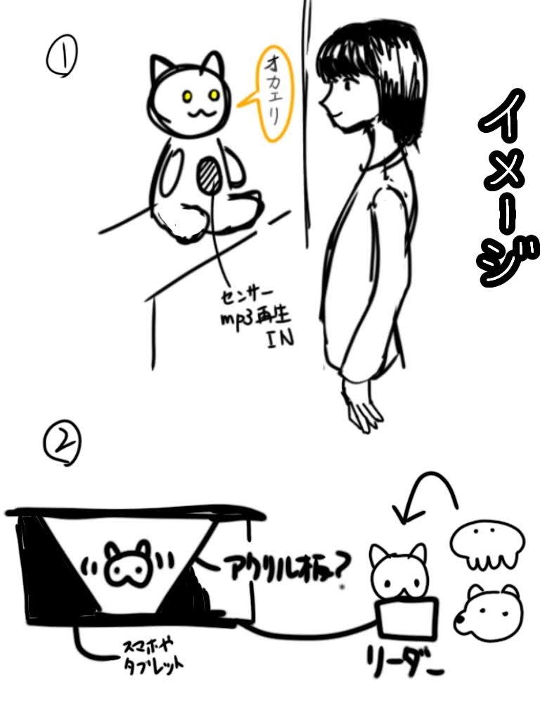 - アイデア構想 (1)おかえりと言ってくれるマシン 玄関に置いて、人感センサーで家主が通ったら「おかえり」と言ってくれる、mp3音声再生機能。さらにledが同時に光る。これをぬいぐるみに付ける。一人暮らしで帰ってきてもおかえりと言われると寂しくない! (2)立体ホログラム スマホやタブレット等と透明な板を使った立体ホログラム。作成した映像を立体に見ることが出来る。さらにリーダーを用意し、それにいくつかのぬいぐるみをひとつ選び、載せるとそのぬいぐるみが動く映像に切り替わって立体になって流れる。コロナ禍で人と会えなくても、まるでとてもかわいいぬいぐるみがそこにいるような映像で寂しくない!