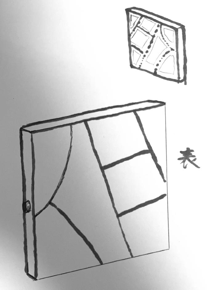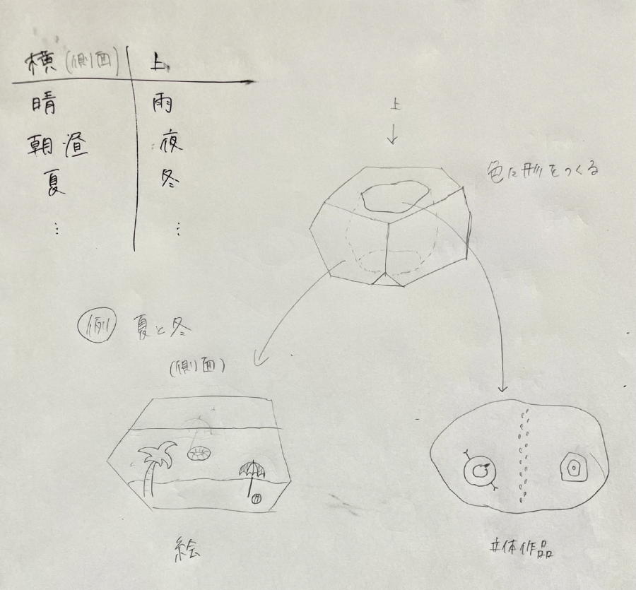 - 「思わず覗き込みたくなる箱」から、ある視点から見るとひと目見た時とは違うものが見えるというアイディアを得て考えました。先輩の作品は一番上の形と一番奥の形の二面でしたが、私は横と上の二面を考えます。簡単な例として横から見ると直線から成る立体ですが、上から見ると曲線からなる立体が見えるというようなものです。これを先輩の作品の星座のような具体例に置き換えたいと思います。中を空洞にして上から見たときだけその空洞に表現したいものが見えるようにしたいです。完全に観賞用になると思いますが、どこから見たら何が見えるのかを想像しながら見ると面白いと思いました。