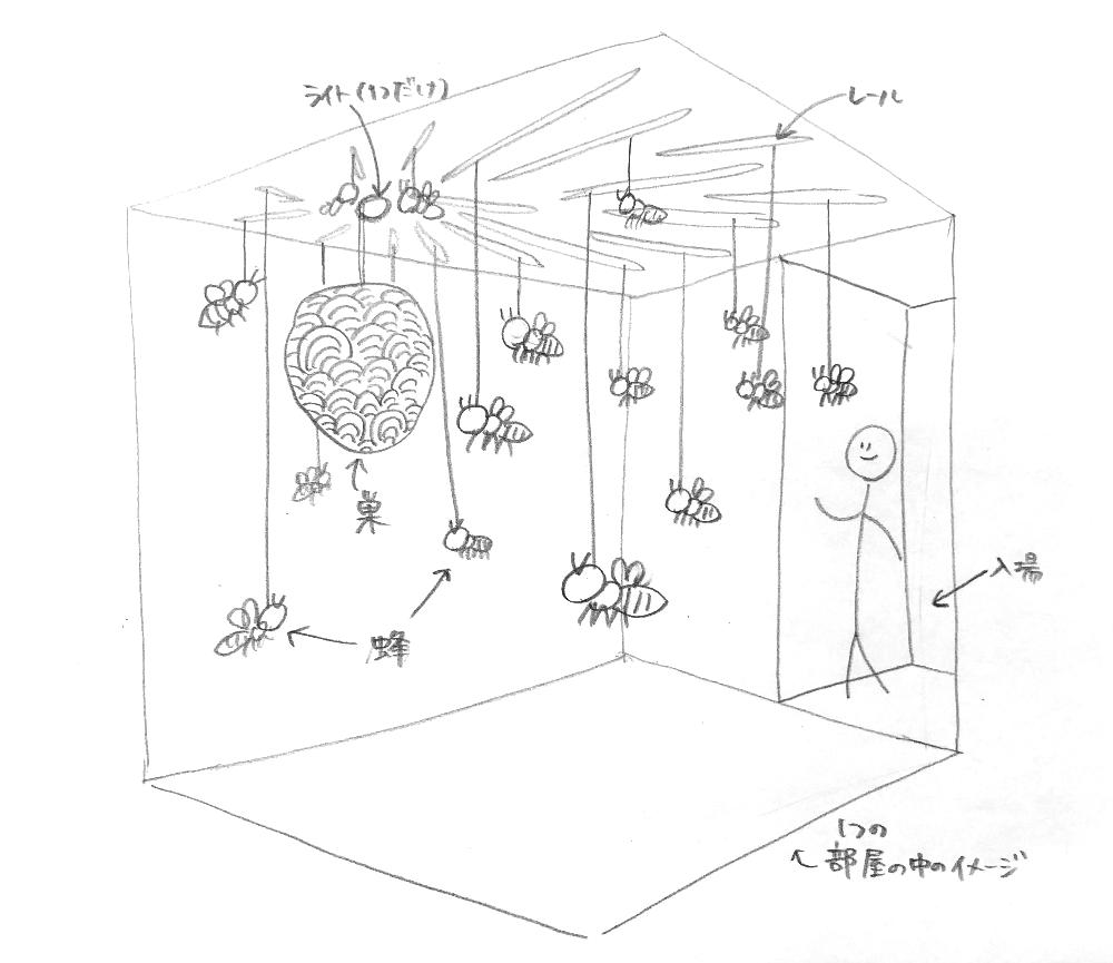 - 『はち』という作品から発展させたインタラクティブ作品のアイディア構想です。一つの空間の中にたくさんの蜂とその巣を設置する。二つとも天井から吊されているが、蜂にはレールがあり常に数cmレール上を往復している。照明は巣の上にあるライトのみ。一定距離巣に近づくと、蜂が人に向かって近づいて来る(蜂のレールは巣から放射状に設置されているため、巣に近づくことができる)。天井か床に赤外線センサを設置して人を感知する。巣に触ると電気が流れ痛みを感じる(微弱にする)。巣の中に静電気発生装置を入れ、触るとピリッと感じるようにする。薄暗い中で攻撃性のある大量の蜂と同じ空間にいる恐怖を感じさせ、巣を触るという好奇心がインタラクションに繋がる作品とする。