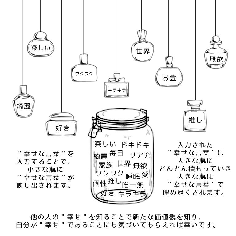 - 「幸せの○」が印象的でした。広義の意味での"ディスプレイ"の話がありましたが、視覚・聴覚・味覚・嗅覚・触覚などを使ってどのように幸せを表すかが重要になってくると思うので、様々な表現方法を試してみたいです。 詩想作曲法もとても素敵だと感じました。詩が好きなのですが中々見る機会がないので、キーボード(音楽)と合わせることで、その場だけの新しい詩が生まれるのがとても興味深いです。これまでの先輩方の作品を参考にして、企画したのが「幸せな言葉で幸せを」です。参加してくれる人に"幸せな言葉"を入力してもらい、それを小さな瓶の中に表示されるようにします。その瓶の中にある"幸せな言葉"を見て、幸せになった人が別の"幸せな言葉"をまた入力します。その連鎖を繰り返すことで、大きな瓶の中にはたくさんの"幸せ"が積もっていくというものです。他の人の"幸せ"を知ることで新たな価値観を知り、自分が"幸せ"であることにも気づいてもらえれば幸いです。