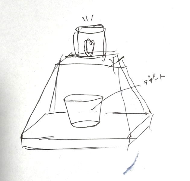- 「はやくスシになりたい」を参考にした「開花」を提案する。鉢に水をそそぐとスクリーンに開花する花が投影されるもの。まずRFIDリーダーを土台に設置する。次に実際に水やりをするように鉢に水を注ぐと、バネで吊るされた鉢が水の重さで台に接触する。すると、鉢の底にある金属対応のRFIDタグが反応し、背面に設置したリア投影スクリーンに花が開花するアニメーションが映される。鉢から花が咲くように見せたいので鉢はスクリーンの真ん中に設置したい。鉢の種類は形の異なったものを4つ。鉢を鍛金で制作し、RFIDを内蔵する部分は木で作ることで、工芸の技術とインタラクティブなシステムを融合させたいと考えた。