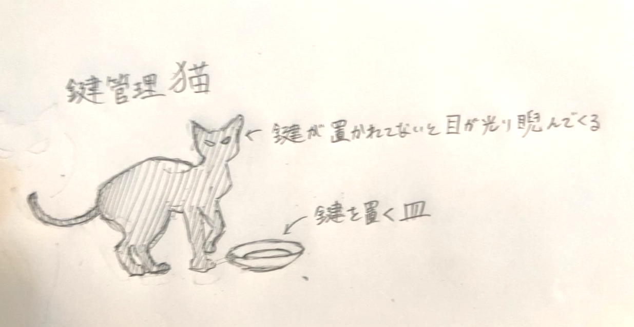 - 僕が提案するのは鍵を管理してくれる猫です。内容としては鍵を置かないといけない指定の場所に鍵がないと猫の目が光り、睨みつけてくるものです。これを作りたい理由としては自分が鍵の管理が緩い部分があり鍵の管理場所が毎回ころころ変わってしまうので鍵を置いておく場所を決めておきたいからです。これが役に立つ場面としては夜寝る時に電気を消して鍵が置かれていないと、猫の目が光るので自分が鍵を指定の場所に置き忘れていることに気付けるようになっています