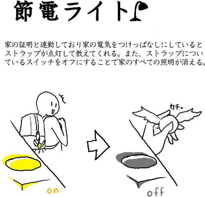 - 私は家を出てから部屋の明かりを消してきたかどうか不安になることが多々ある。そこで、「つながる光」から発想した「節電ライト」を考えた。この「節電ライト」は「つながる光」のような部屋の明かりと連動して光がつくというシステムを応用して、家の照明をストラップと連動させることで照明を切り忘れているときに点灯して視覚的に教えてくれるという仕組みだ。また、「つながる光」とは違い照明の情報を入力するだけでなく、仮に部屋の明かりを切り忘れていてもストラップのスイッチを切ることで同時に部屋の明かりも消えるという相互的に作用する仕組みである。