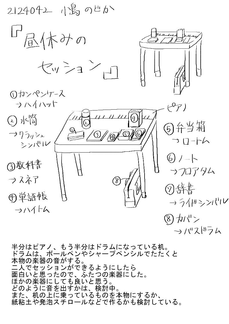 - 先輩方の作品をいくつか拝見させていただくと、音楽に関係するものが多かったので、私も音楽を使った楽しいものを作りたいと思いました。そこで、学校の昼休みに暇をつぶすため、机や文房具を楽器代わりに使っていたことをテーマに作品案を考えました。机や教科書などから本物の楽器の音が鳴って、それでセッションできたら面白いと思ったので、この作品案を提案しようと思います。セッションというと複数の楽器が必要になるので、ひとつの机でピアノとドラムが演奏できるようにしたいと思っています。ドラムを構成するのは、教科書やノート、水筒などの学校で使っていたものです。実際に楽器で演奏するよりも、もっと気楽に、遊びのようにできるので楽器に親しみを持てる人が増えると思いました。