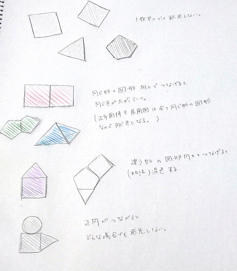 - 私は、「つながるヒト」という作品を参考にして、1辺の長さが同じである、3種類の平面図形を繋げることで、図形が光り、次々と繋げていくことで色が変化していくものを作ることを考えました。平面図形として正方形や正三角形、正五角形をあげます。なぜなら、これらの図形は同じ図形を繋げていくと正多面体をつくることが出来るためです。また、同じ図形を繋げれば、同じ色の光が広がっていき、別の図形を繋げると色が混ざっています。このとき、光の三原色を用いて、混色も加法混色を用います。これらは遊びながら勉強につながるので、子供向けの玩具として考えています。ひとつ例外の図形として、他の図形の1辺と半径が同じである、正円を追加し、正円が繋がると色が消える仕組みにします。