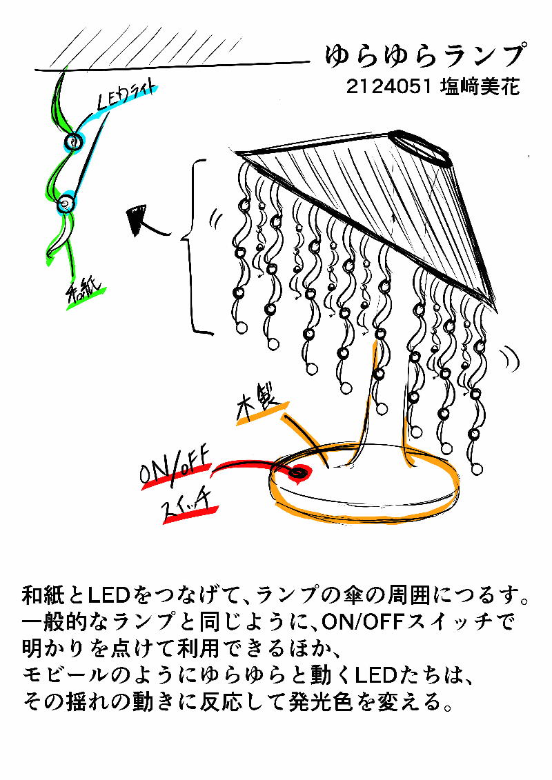 - 私は、「ゆらゆらランプ」という作品を企画案として考案しました。外見は、一般的な傘のあるランプと同じ形をしているのですが、傘の周囲には和紙と小さなLEDライトを一本一本つなげたものをつるしてあります。モビールのように風にゆらゆらと揺れるその動きに反応して、LEDライトは柔らかな発光をするようになっており、その色も動きによって変わります。ON・OFFスイッチもついているので、傘の内側にある普通のLEDライトを利用して明かりを点けることも可能です。内側のLEDライトのみ、周囲の色が変わるLEDライトのみ、あるいはその二つを同時に点灯する、など、多彩な楽しみ方、使い方ができるのではないかと思います。私自身普段から読書を趣味として楽しんでいるので、本の世界に入り浸るために邪魔にならない、それでいて読みやすさの手助けになるようなインタラクティブな作品を考えました。