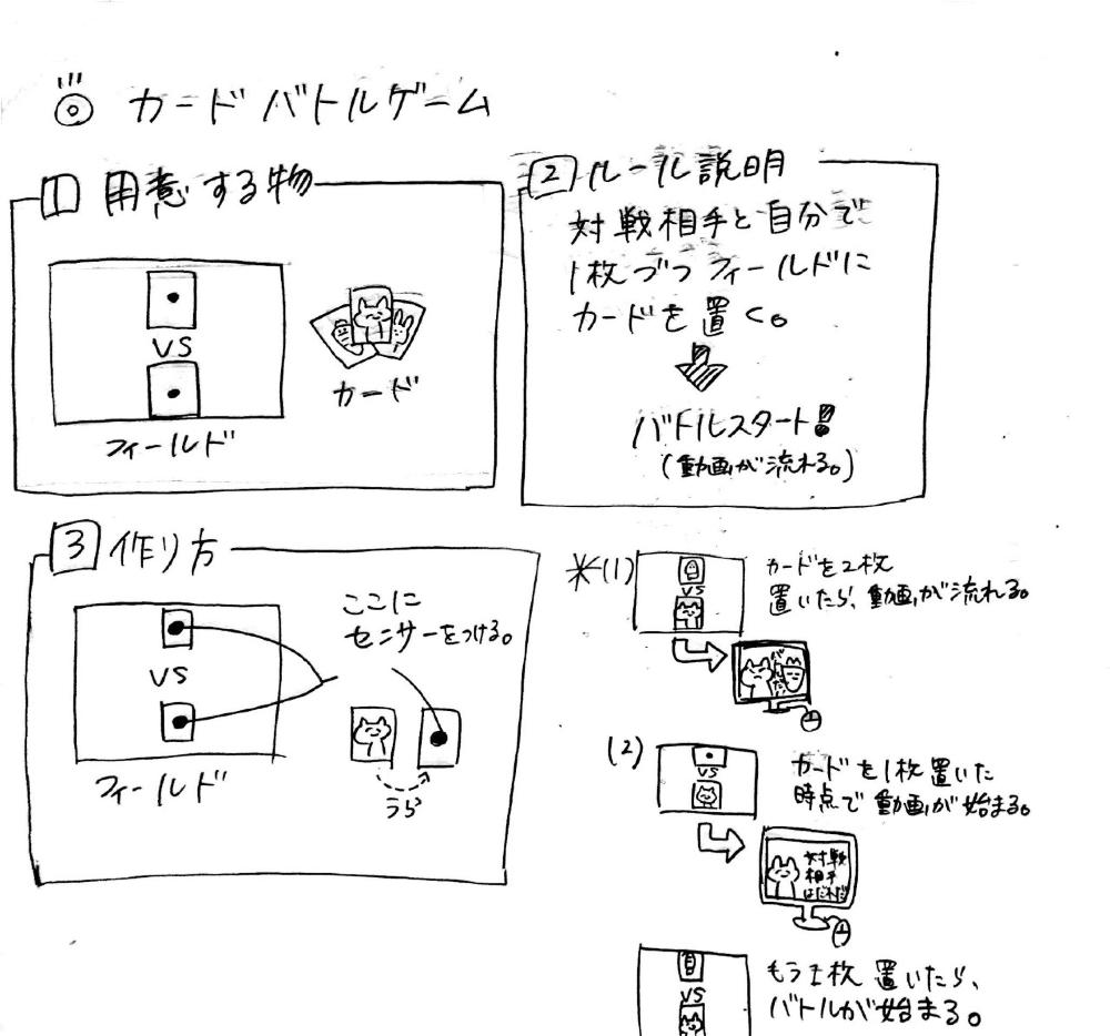 - カードバトルゲーム。参考にしたのは、ひだまりのおもちゃ屋さん、異世界旅行を参考に考えました。どう言ったものかと言うと、カードを用意してそのカードにセンサーをつけます。土台となるフィールド(そこにもセンサーを付ける)にそのカードを2枚置くと、予め用意しておいた動画が流れ、対戦ゲームのようにバトルが始まるというものです。今までの先輩の作品とは違う所は、2個のセンサーを使うと言う点です。2個のセンサーの組み合わせで動画を1本作るのか(カードが多いほど作る動画が多くなる)カード1枚につき画面にキャラを一体表示させ、2枚目を置くことでもう一体が登場するのか。どっちを採用したほうがいいのか、作ってみないと分からないと思いました。