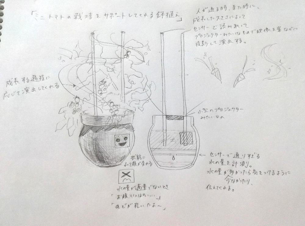 - 「ミニトマトの栽培をサポートしてくれる鉢」。この鉢植えは、小学校で育てる植物や野菜(この場合はミニトマト)を成長に応じて葉や壁などに投影して演出してくれたり、水の適量を鉢植えについた表情や言葉で伝えてくれたりと初心者が楽しく、分かりやすく栽培できるようになっている。仕組みは、支柱についたセンサーが人の動きと植物の高さを読み取り、人が通ったときにどこまでも成長出来ているかをプロジェクターのようなもので投影して教えてくれる。また、水の量については、モニターに映されるミニトマトモチーフの鉢植えの表情と声で表示され、水が適量のとき、水が適量ではないとき、その他で三種類ある。これが学校の中庭で並んでいたら楽しそうだと思った。