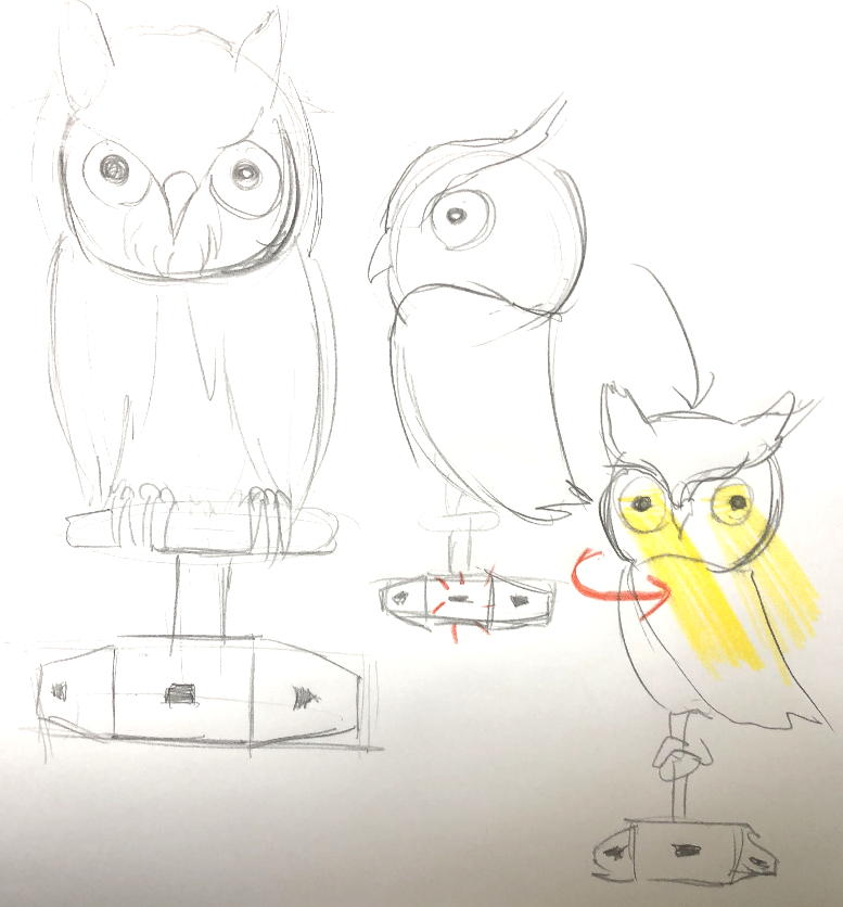- 私は『はち』という作品で、センサとそれに合わせた動きで生物の動きを再現、模倣するというのがとても面白いと思いました。私はこの仕組みがほかの生物にも応用できないかと考えました。例えば、私が思いついた作品は『フクロウ』です。フクロウというのは首を左右に270度回転させることができます。そこから、フクロウの模型の首にモーターをつけて、台座につけたセンサに反応した方向を向くなどすれば面白いのではないかと考えました。また、フクロウは夜行性なので目が光るといったギミックを搭載しても面白いと思いました。さらに、センサに合わせてあの特徴的な「ホー、ホー」という鳴き声も出すことができたらよいと考えました。お化け屋敷などに使っても雰囲気が出ていいと思います。