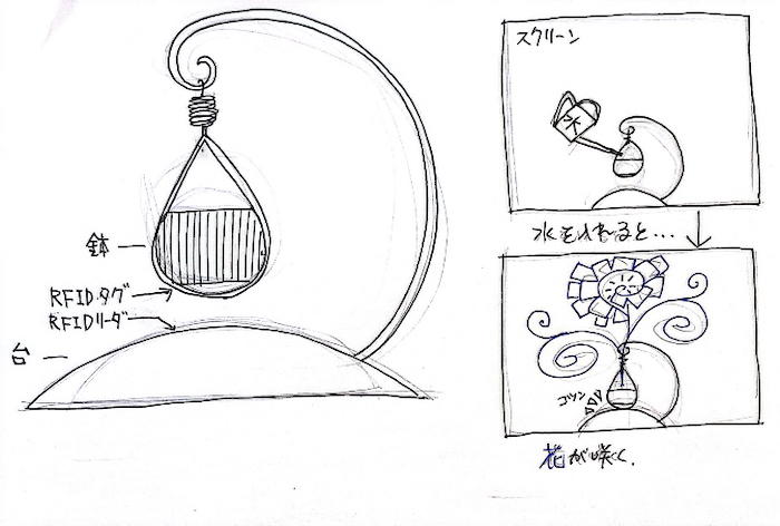 センサとしてRFIDを使うというのはちょっと筋違いです。RFIDはセンサが感知すればONとなるだけで、水を入れて重くなって距離が近付いたというような情報を検出するのには向きません。「鉢から花が咲くよう」なニュアンスであれば、単純なON/OFFでなく、水を入れたら次第に花が咲くようにしたいものです。鉢を取り替えたことを検出するのはRFIDでなくても色々な方法で簡単に実現できます。
