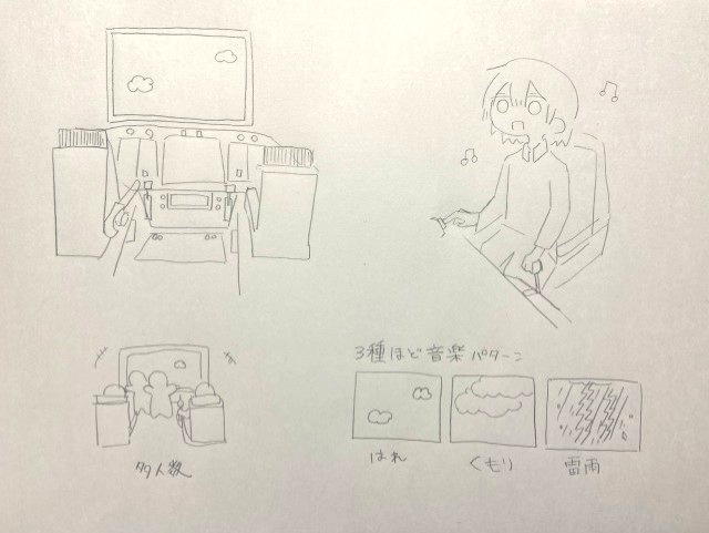 - 私は「Beat Box」という作品の、一人でも多人数でも、正解のない音楽を演奏して楽しめる点が良いと感じた。「インスタレーション作品の2種類の『お客さん』」という先生の視点を組み合わせて作品企画案を考えた。コックピットビートというものである。その名の通りコックピットのような椅子に座って、いくつものボタンやレバーで音を鳴らして遊ぶことができる。自分の手で音を操縦しているような感覚になることができて面白いのではないかと考える。正面にモニターを置いて空の映像を流して、押すボタンに対応して鳥が飛ぶなどの演出。
