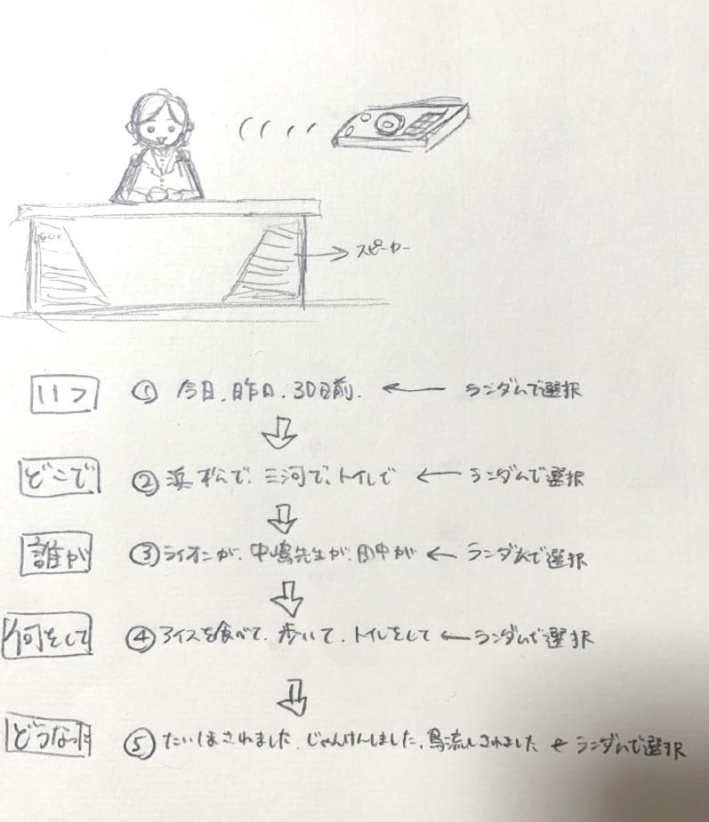 - 【あなたに速報!!】 ニュースキャスターを中心に置いたセットを作成し、テレビのリモコンを操作するとランダムに生成されるニュースが流れると言うものです。いつ、どこで、誰が、何をして、どうなったかの五つのカテゴリーを作ります。それぞれのカテゴリーに5−10ほどのパターンを入力し、順番に読み上げさせることによって数十種類のニュースの内容が自動で生成される仕組みです。音声の流れでは、「速報の合図」→「ニュースのお時間です」→「いつどこで誰が何をしてどうなった」→「そのニュースの概要をカテゴリー別に詳しくランダムに説明する」。ニュースキャスターの口が読み上げるときにぱくぱくすると、なおリアルで面白そうです。