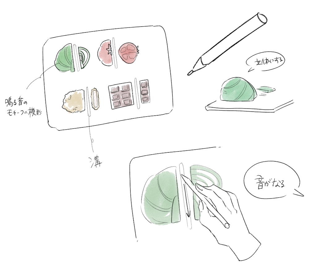 - 私は「streetscape」という作品から、様々な食べ物を切る音を収録してナイフ型のペンを食べ物にタッチすることで切る音を楽しめるASMRのような作品を作ってみると面白そうだと思いました。キャベツなどの野菜類や揚げ物など切る時にいい音がするものを収録し、聞くことで幸せな気分になれる作品を考え、収録したモチーフの模型を作ることでより視覚的に体験できるシステムを考えました。streetscapeの作品を見るとタブレットの上に溝が引いてあるので、それを参考にしてモチーフを切ったように見えるように溝引いてそこをなぞると音が出るシステムにしたいです。