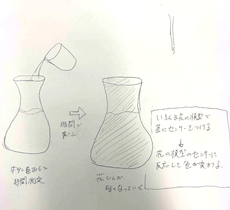 - 私は花瓶に注目して水を入れると外からどれくらい水が入ったかがわかり、また水を変えてからどのくらい時間が経ったかを花瓶の色の彩度の変化で教えてくれるというのを考えました。これは私が長続きしない性格で水やりを忘れて花を枯らしてしまったことがあったからです。また入れる花によっても色相が変わるという変化も考えました。普段変化のない花瓶側を変化させることで水の状態が外から見てわかるというのがポイントで、毎回の水の交換が楽しくなると思います。
