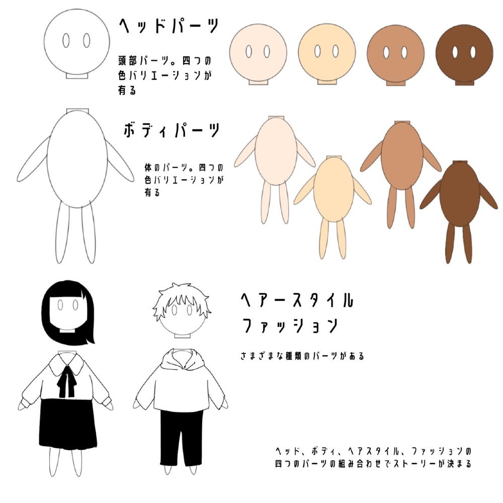 - わたしは、「はやくスシになりたい」と言う作品の、パーツとパーツを組み合わせでストーリーが生まれると言う特徴が面白いと思った。その上で、参考にした作品ではベースとなるパーツはシャリに固定されていたが、ベースも変えればより面白くなるのではと思い新しい作品を考えた。「わたしだけのキャラメーカー」と言うこの作品は、ボディ、ヘッドの二つのベースとなるパーツと、ヘアースタイル、ファッションという二つの追加パーツを使ってオリジナルのキャラを作り出すものだ。出来上がったキャラクターを台の上に載せると、つながった画面上に名前とショートムービーが表示される。それぞれの組み合わせに名前があり、例えば画面左下のロングヘアのキャラクターは「世間知らずのお嬢様」でその隣のパーカーのキャラクターは「やんちゃなアルバイター」のように、それぞれが個性を持ったキャラクターとして成立するようになっている。また、それぞれのショートムービー上で別の組み合わせのキャラクターとの関係を示唆することで、別の組み合わせを考えるきっかけづくりになると考える。