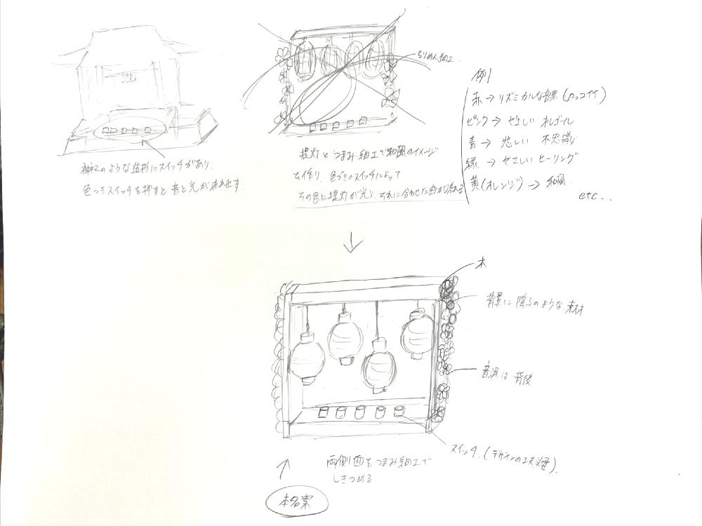 - 過去の作品を拝見し、光と音を効果的に使って空間を演出するものがあり、とても興味を持ちました。特にヒーリング効果のあるものを作りたいと考えているため、BGMを利用した部屋におけるようなものを考えました。フリー音源などを利用し、音に合わせて綺麗な色に変化する置物です。可能であれば数曲用意し、気分に合わせてライトの色を変化させます。外見に関しては、雰囲気を表現できるよう、神社や提灯といった和風な造形物、もしくは植物やシンプルな造形を想定しています。ボタンなどの選択肢を設け、気分に合った曲が流れる仕掛けにしたいと考えています。