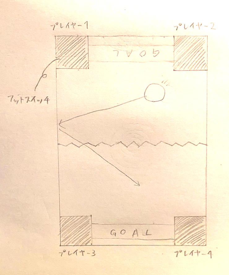 - 私は、作品事例の「えんむすび」という作品を見て、フットスイッチを踏むと、光の円が音と一緒に飛び出す様子が面白いなと思ったので、この作品を参考にして、「フットエアホッケー」というゲーム作品を考えました。ゲームセンターなどにあるエアホッケーを、フットスイッチを使って4人で行うゲームです。2対2のチーム戦で、フットスイッチを踏む力や、2人の踏むタイミングなどで光の玉の威力を決めて競い合います。また、ゴールに玉を入れられないようにフットスイッチを踏んで防ぎます。手で行うエアホッケーよりもコートが大きいので、迫力があって見ている人も楽しめるのではないかと考えました。