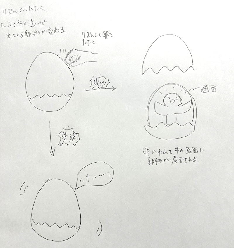 - 「おはよう卵ちゃん」というデバイスを考えた。卵の形をしていて、普通に引っ張って卵を開けることは出来ないようにしておく(卵をロックする)。しかし、この卵をリズム良く叩くと卵が割れ、卵の中の画面に動物のアニメーションが表示される。叩くリズムは何パターンも用意しておき、叩いたリズムによって中の画面に表示される動物も変わるようにする。ヒヨコ、恐竜、蛇、ダチョウ、ペンギン、カモノハシなど、実際に卵から生まれる動物のアニメーションを表示させる。上手くリズムが叩けなかった場合は中から変な声がして、卵が振動する。失敗すると卵は割れない。「おはよう卵ちゃん」はリズムゲーム的な要素を含んでいる。
