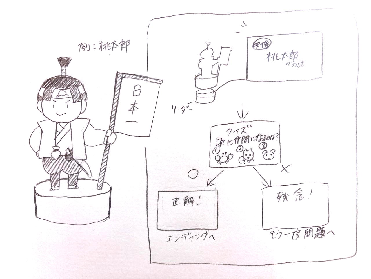 画面内で閉じた世界で表現できる「選択ゲーム」であれば、無理して人形を用意する必要は無いかもしれません。先輩のFLASH作品「ももたろう」は、