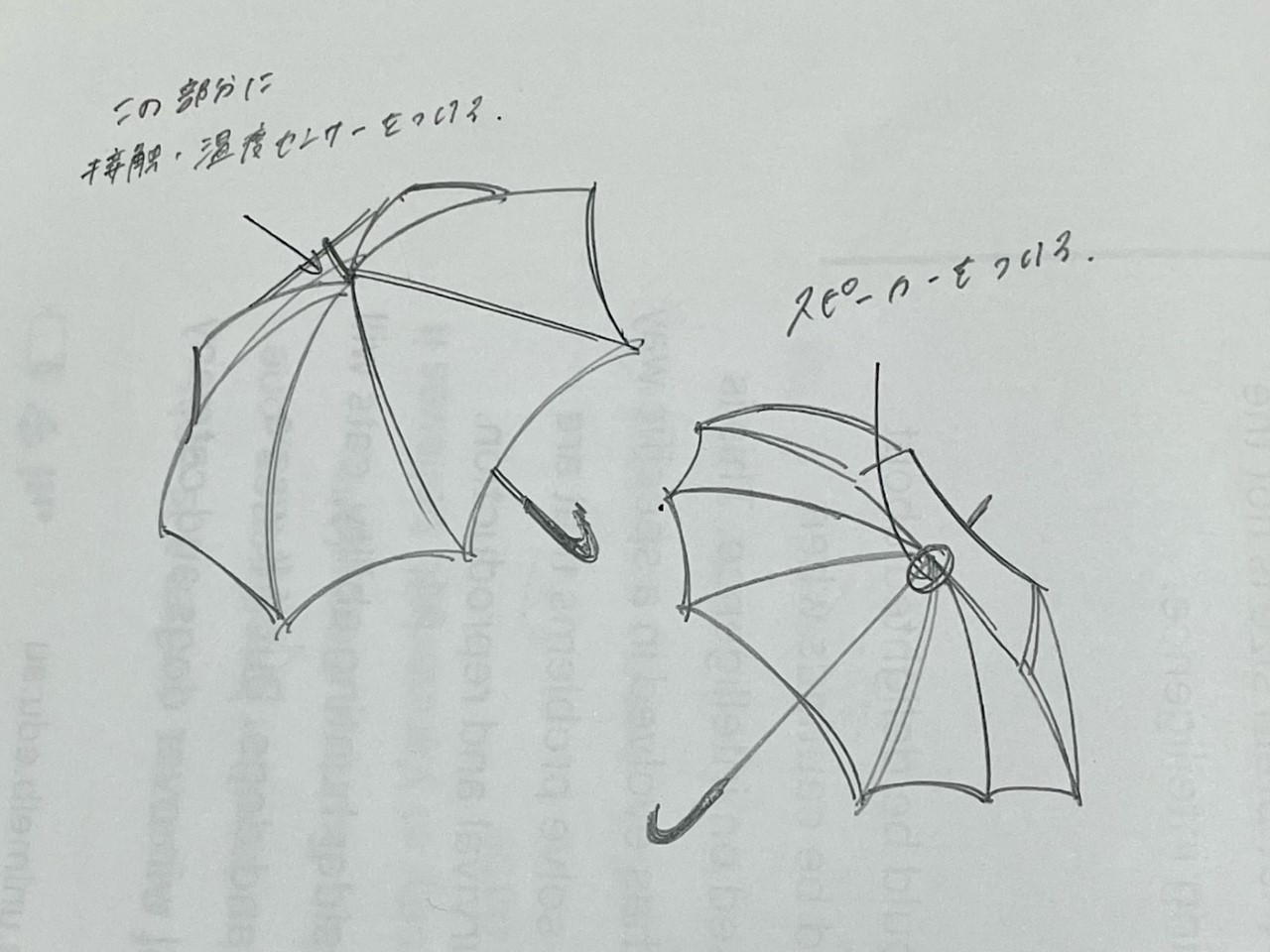- 私は憂鬱な雨の日を楽しく過ごすための傘を考案したいと思います。雪の日も適応することができます。過去の「うたかた」という作品から、触れると対応したサウンドが鳴るインタラクションを日常で応用させたいなと考えました。この傘は表面に接触センサーと温度センサーが付いていて雨と雪を感知します。傘の表面に水がつくと接触センサーが反応し、音楽が流れる仕組みになっています。また温度センサーも取り入れて、0℃以上なら雨、0℃以下なら雪と、天気を判別して雨と雪で違う音楽が流れます。この傘を使うことで雨の日の子供たちの通園、通学が楽しくなるのではないかと思います。