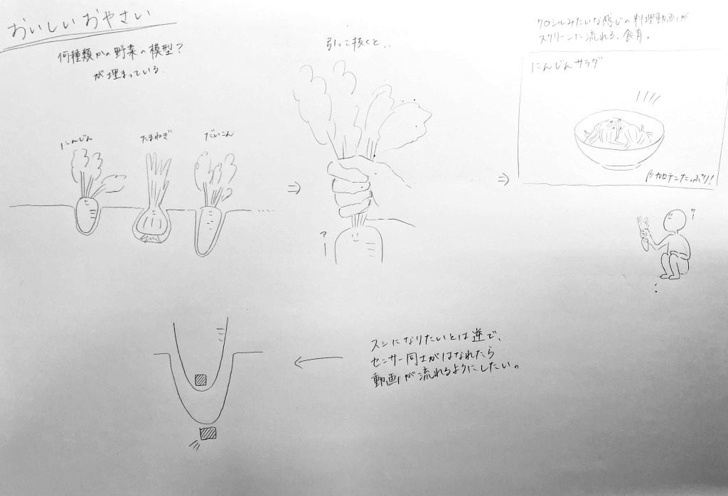- 「おいしいおやさい」という提案を考えました。「shocking」と「はやくスシになりたい」から発展させたアイディア構想です。地面に埋まっている色々な野菜を収穫すると、スクリーンにその野菜を使った料理のレシピ動画が再生されるというものです。小さい子供向けの食育をテーマに考えました。